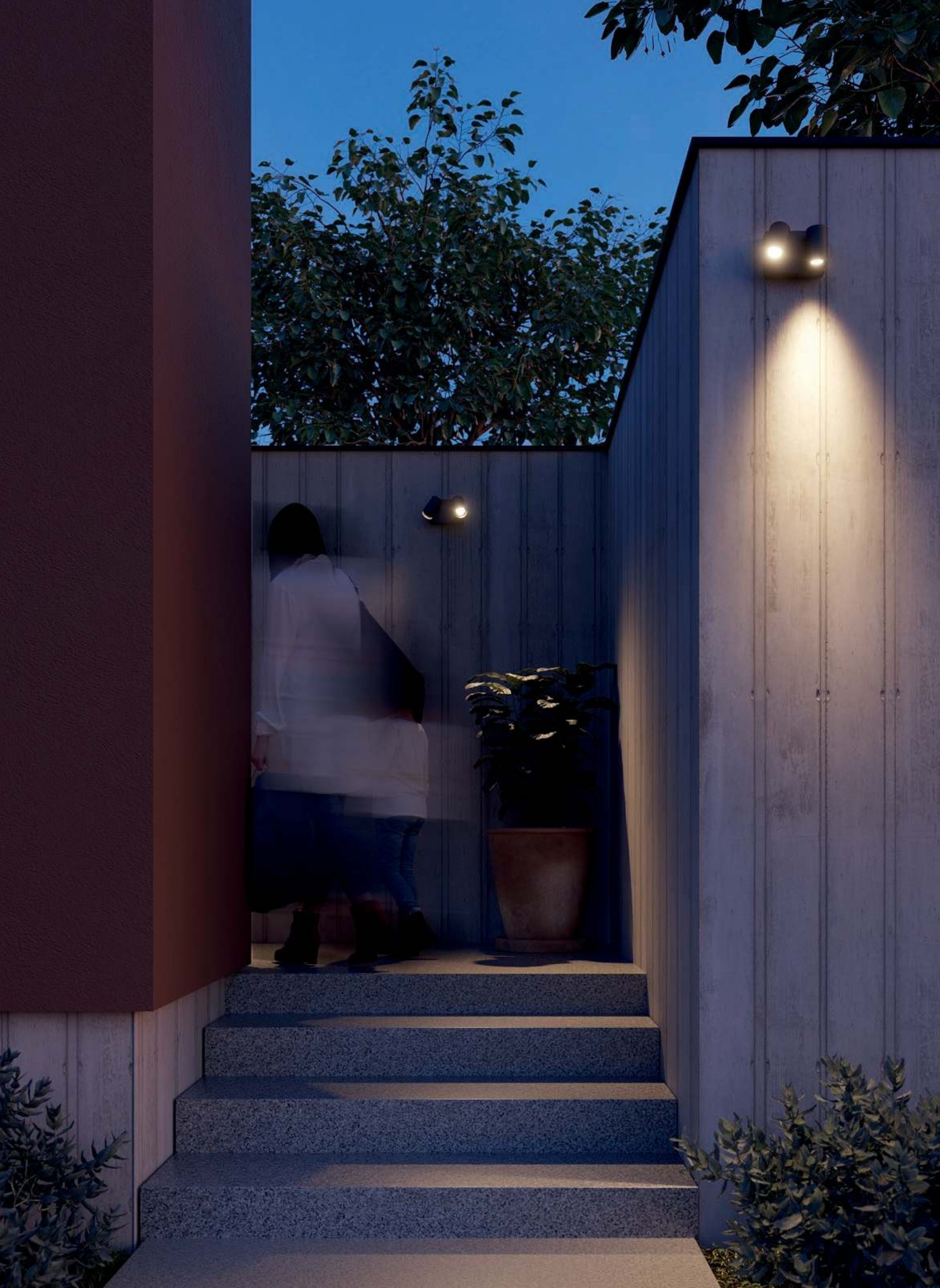 алуминиево тяло излято под налягане в тъмно сив цвят, прозрачни стъклени дифузери, възможност за насочване, сензор за движение и светлина, CCT 2200K/3000K/4000K