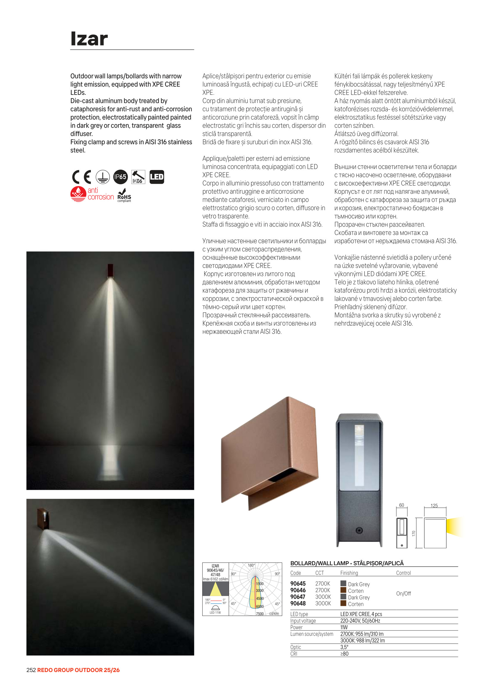 Лед аплик, външна лампа 90648 ще осигури комфорт и естетика във всяко помещение, в което се постави. Цялостната визия и дизайн на led лампата и вложените в изработката й материали, като отлят под налягане алуминий, обработен с катафореза за защита от ръжда и корозия, с електростатично нанесено покритие в цвят ръжда, прозрачен стъклен разсейвател, скобата и винтовете за монтаж са изработени от неръждаема стомана AISI 316, ще допринесат за един неповторим стил. Благодарение на дългогодишния опит в производството на лед осветление, качествените материали и строгия контрол на качеството на изработка на дизайнерската линия Redo Outdoor на производителя Redo (Румъния), 90648 е на високо европейско ниво.