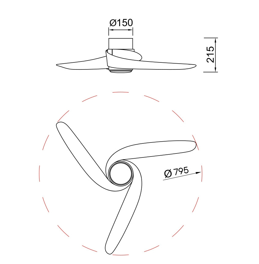 метал в бял цвят, полимер (ABS) в цвят светло дърво, дифузьор от полимер в бяло, DC мотор 30W, смяна на цветната температура (2700К/4000К/5000К), посоката и скоростта на въртене чрез дистанционно, включено в комплекта