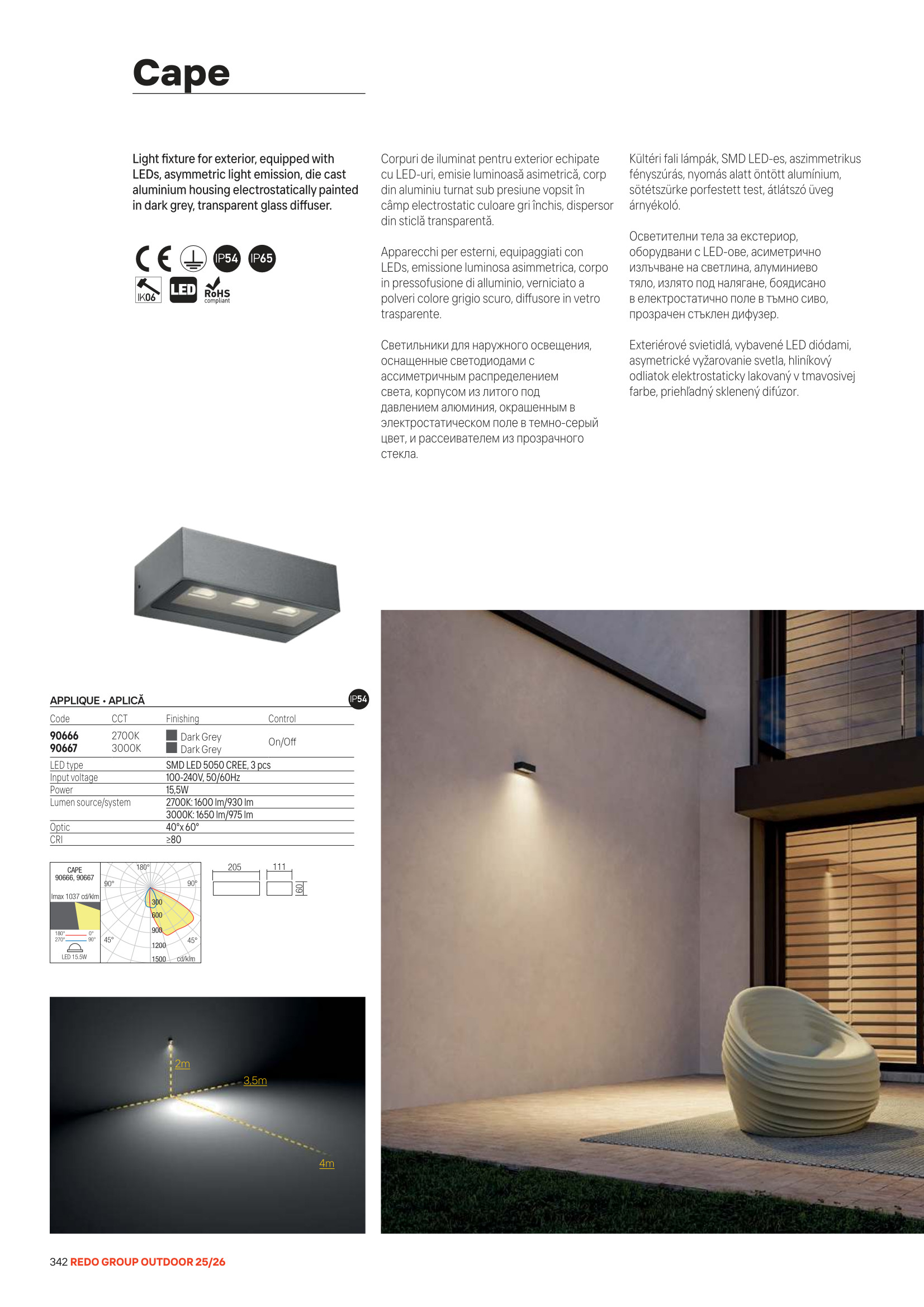Лед аплик, външна лампа 90667 ще осигури комфорт и естетика във всяко помещение, в което се постави. Цялостната визия и дизайн на led лампата и вложените в изработката й материали, като отлят под налягане алуминий с електростатично нанесено покритие в тъмно сиво, прозрачен стъклен дифузер, асиметрична дисперсия на светлината, ще допринесат за един неповторим стил. Благодарение на дългогодишния опит в производството на лед осветление, качествените материали и строгия контрол на качеството на изработка на дизайнерската линия Redo Outdoor на производителя Redo (Румъния), 90667 е на високо европейско ниво.