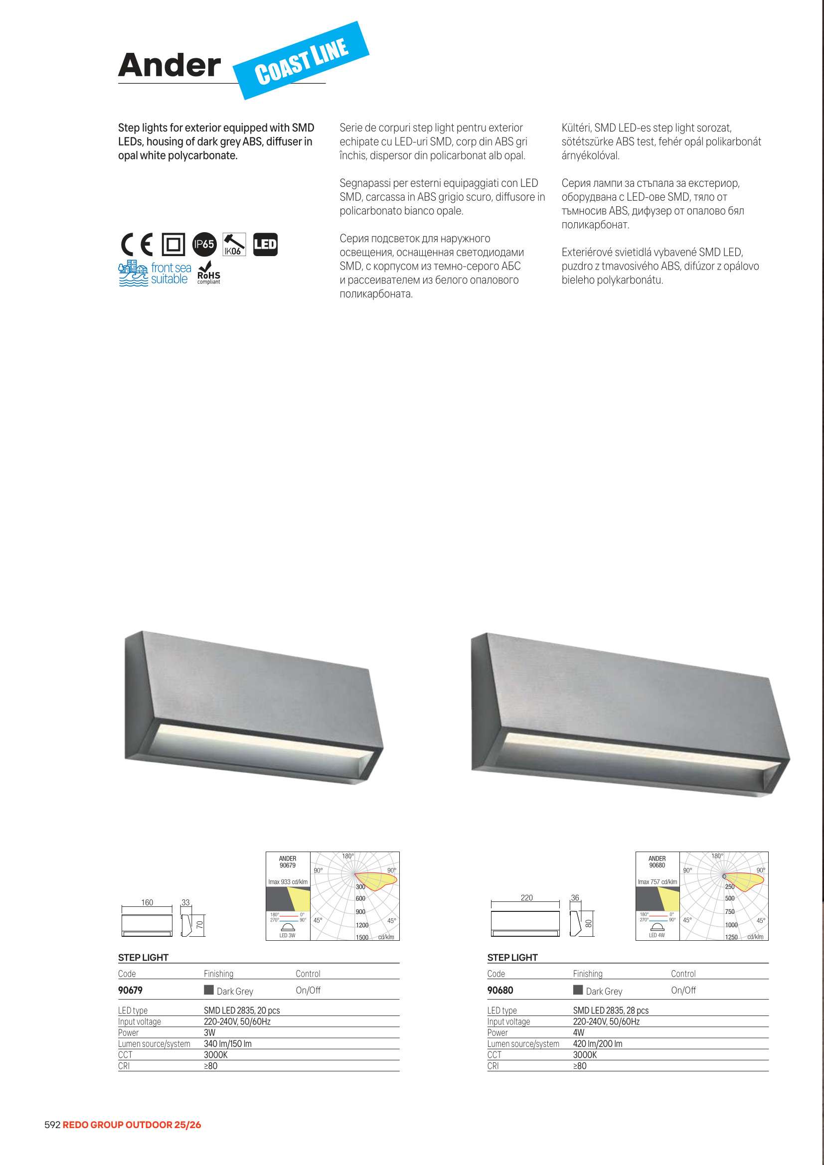 Осветителното тяло 90679 ще осигури комфорт и естетика във всяко помещение, в което се постави. Цялостната визия и дизайн на лампата и вложените в изработката й материали, като тъмносив ABS, дифузер от опалово бял поликарбонат, възможност за монтаж по крайбрежието на морето, ще допринесат за един неповторим стил. Благодарение на дългогодишния опит, качествените материали и строгия контрол на качеството на изработка на дизайнерската линия Redo Outdoor на производителя Redo (Румъния), 90679 е на високо европейско ниво.