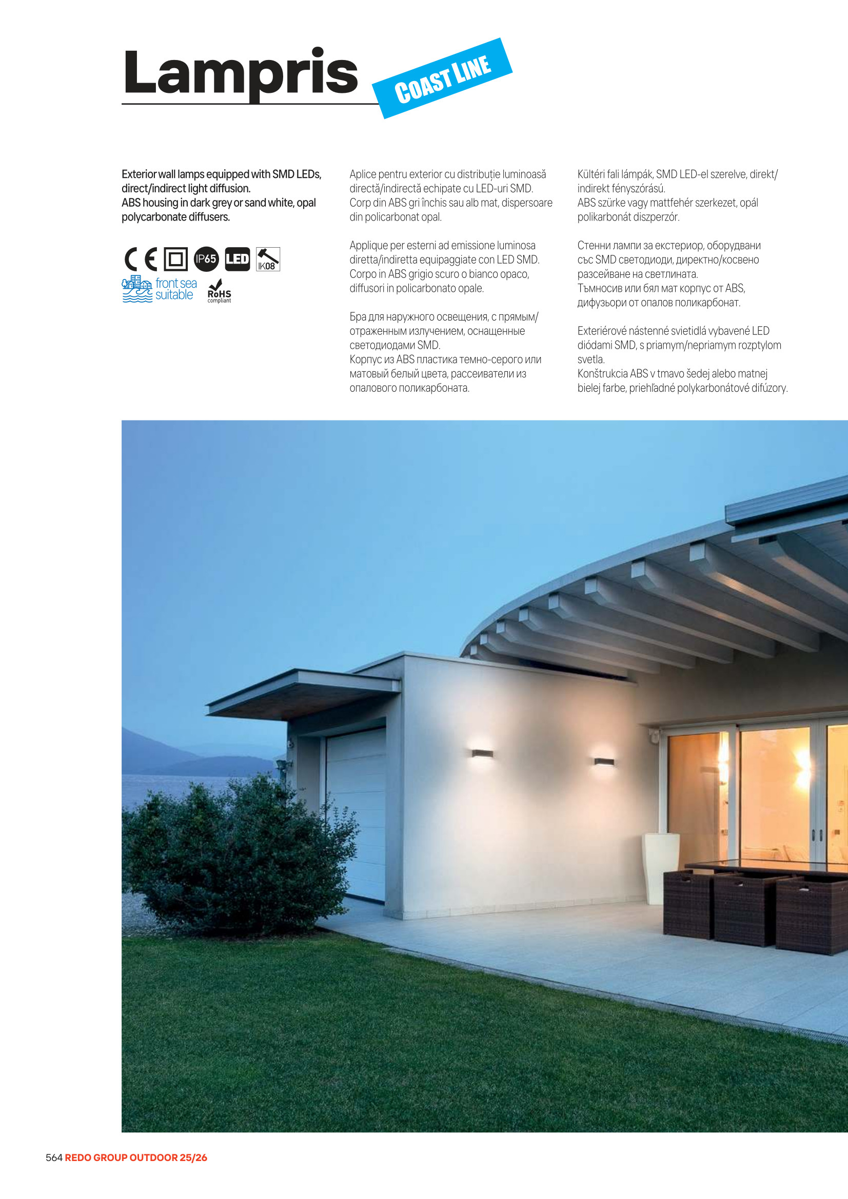 корпус от полимер (ABS) в матово бяло, дифузьори от опалов поликарбонат, възможност за монтаж по крайбрежието на морето
