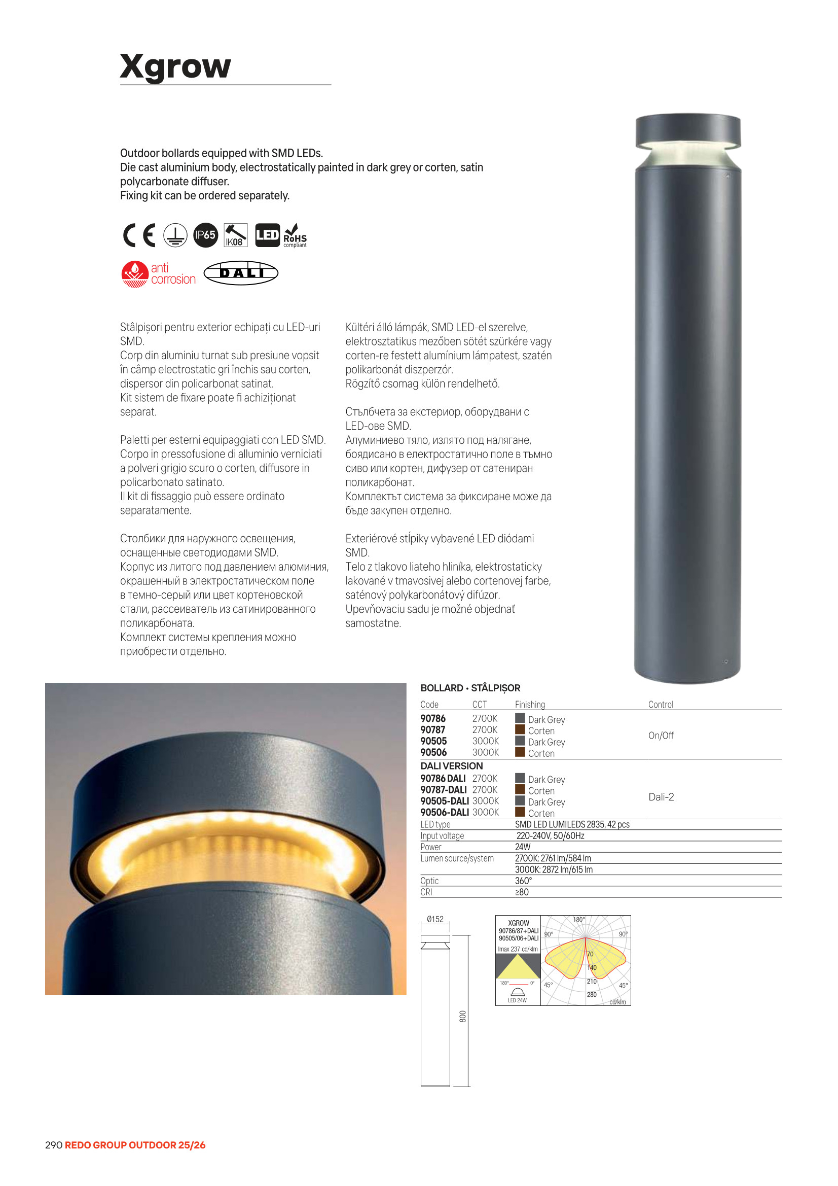 Лед външна лампа 90786-DALI ще осигури комфорт и естетика във всяко помещение, в което се постави. Цялостната визия и дизайн на led лампата и вложените в изработката й материали, като алуминиево тяло, излято под налягане, с нанесено в електростатично поле, покритие, обработено против прах и корозия в цвят тъмно сиво, дифузер от прозрачен поликарбонат, системата за фиксиране CKI01 може да бъде закупена отделно, димиране чрез DALI, ще допринесат за един неповторим стил. Благодарение на дългогодишния опит в производството на лед осветление, качествените материали и строгия контрол на качеството на изработка на дизайнерската линия Redo Outdoor на производителя Redo (Румъния), 90786-DALI е на високо европейско ниво.