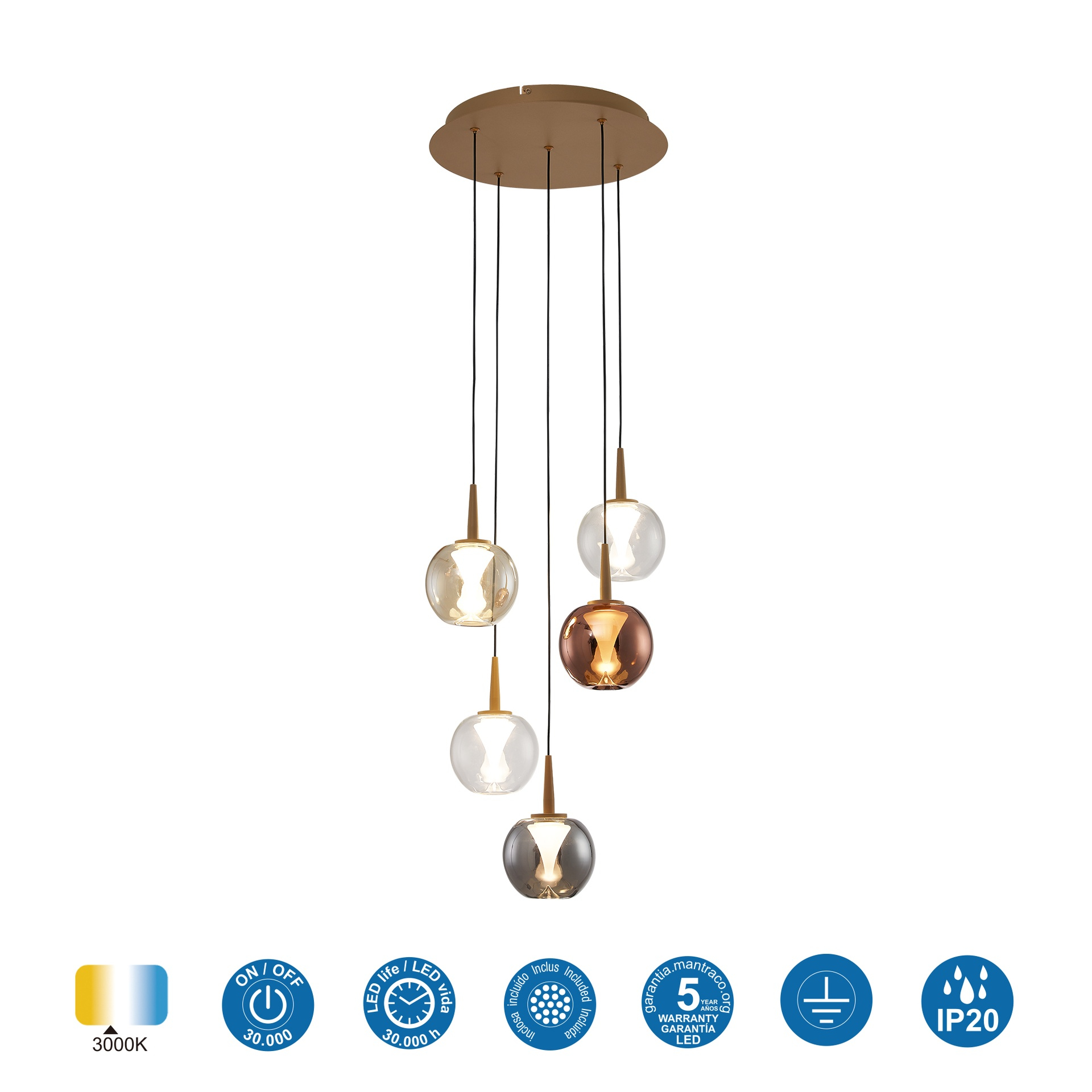 Лед полилей 9080 Gold Round 8941*2+8938+8939+8940 ANDROMEDA ще осигури комфорт и естетика във всяко помещение, в което се постави. Цялостната визия и дизайн на led лампата и вложените в изработката й материали, като метал в цвят злато, стъкло градиентно оцветено в цвят мед, хром, бронз и прозрачно, ще допринесат за един неповторим стил. Благодарение на дългогодишния опит в производството на лед осветление, качествените материали и строгия контрол на качеството на изработка на производителя Mantra (Испания), 9080 Gold Round 8941*2+8938+8939+8940 ANDROMEDA е на високо европейско ниво.