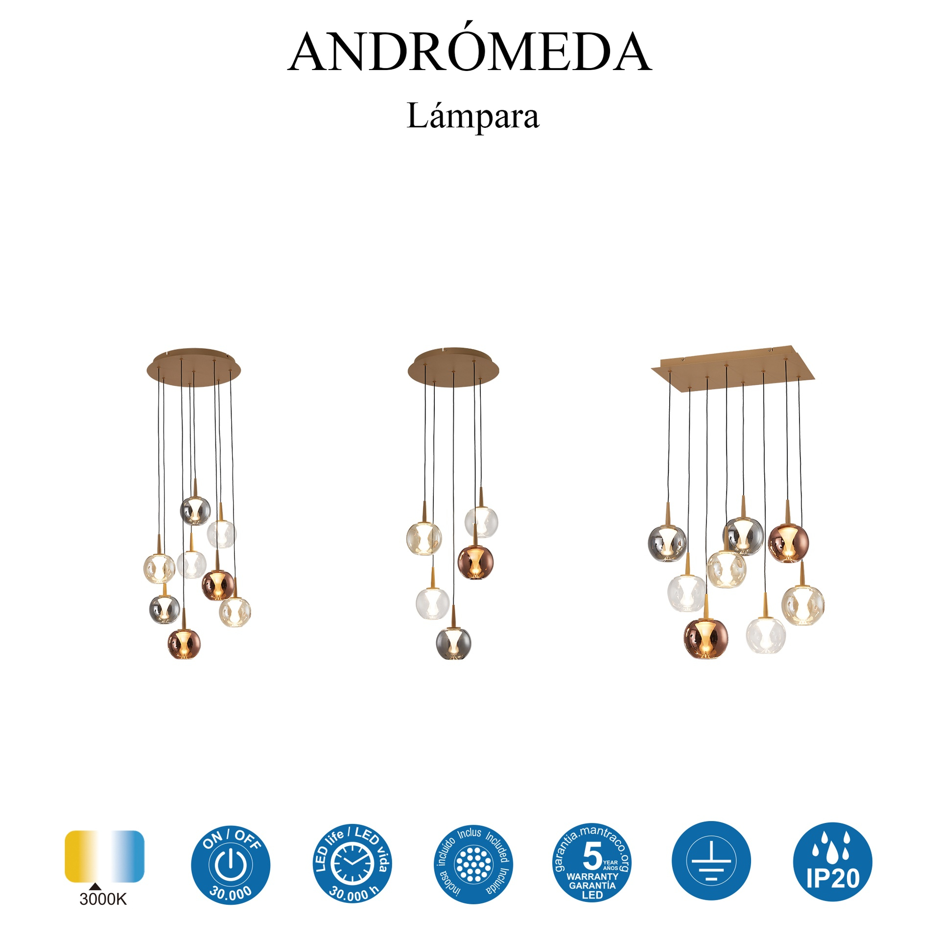 Лед полилей 9081 Gold 8L BASE RECTANGULO- 8941+8938+8939+8940 ANDROMEDA ще осигури комфорт и естетика във всяко помещение, в което се постави. Цялостната визия и дизайн на led лампата и вложените в изработката й материали, като метал в цвят злато, стъкло градиентно оцветено в цвят мед, бронз, хром и прозрачно, ще допринесат за един неповторим стил. Благодарение на дългогодишния опит в производството на лед осветление, качествените материали и строгия контрол на качеството на изработка на производителя Mantra (Испания), 9081 Gold 8L BASE RECTANGULO- 8941+8938+8939+8940 ANDROMEDA е на високо европейско ниво.