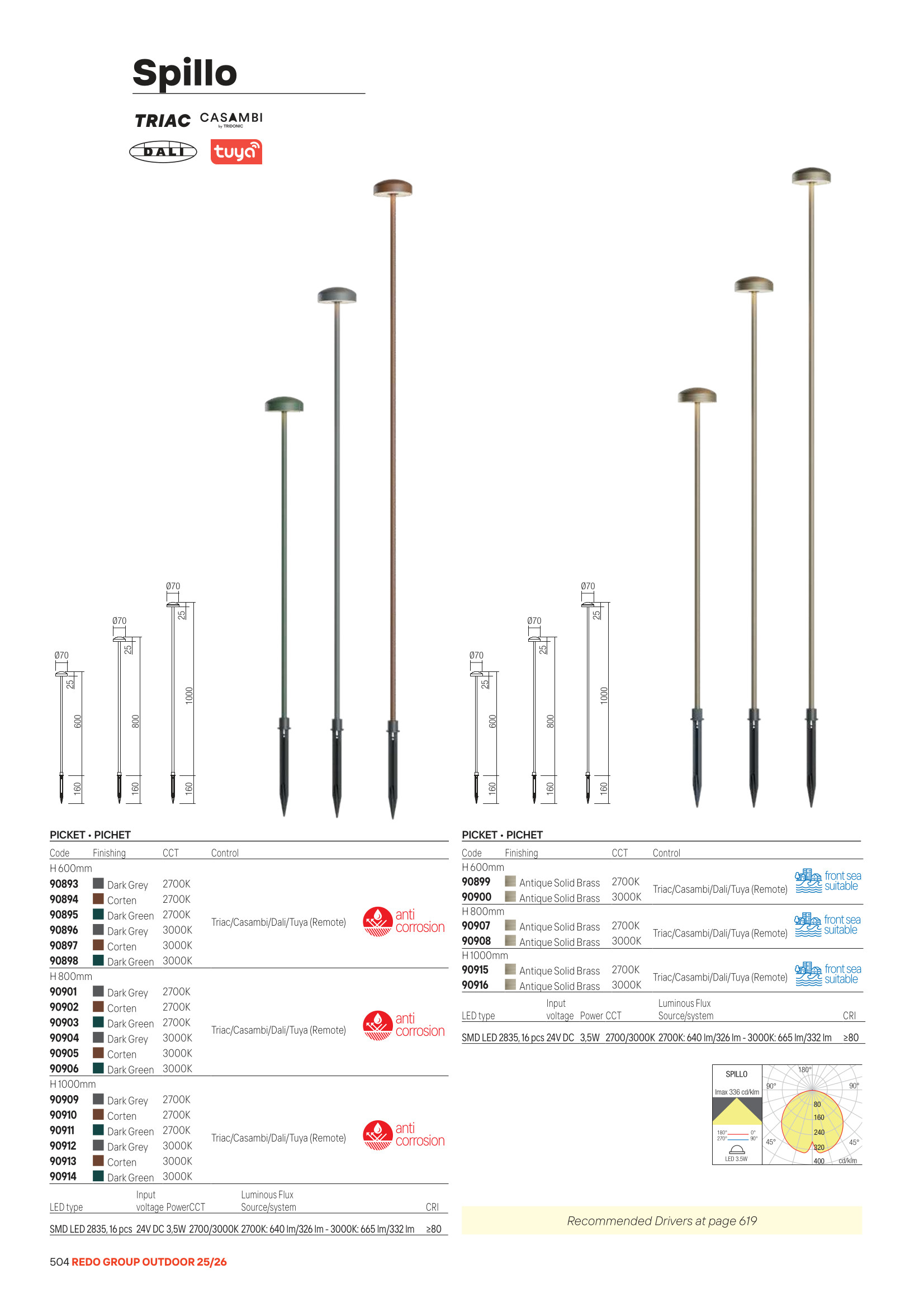 алуминий в цвят античен месинг, дифузер от сатениран поликарбонат, комплектът включва колче за монтаж, 2m захранващ кабел и IP68 конектор, драйверът 24VDC се поръчва отделно, димируемо осветително тяло