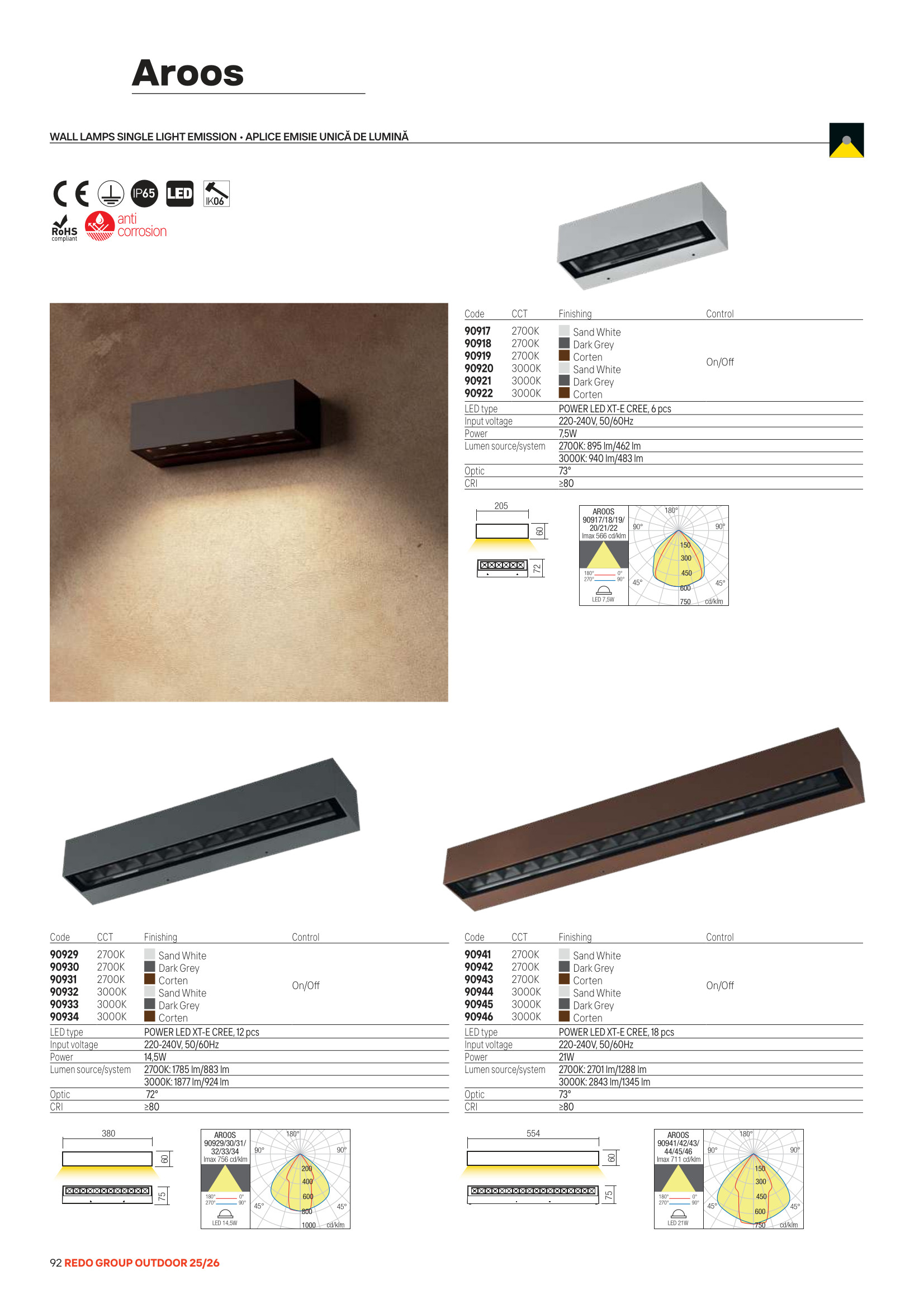 Лед аплик, външна лампа 90946 ще осигури комфорт и естетика във всяко помещение, в което се постави. Цялостната визия и дизайн на led лампата и вложените в изработката й материали, като алуминий отлят под налягане в цвят ръжда с антикорозионна обработка с катафореза, поликарбонатни рефлектори с гпризмовидни закалени стъклени разсейватели, ще допринесат за един неповторим стил. Благодарение на дългогодишния опит в производството на лед осветление, качествените материали и строгия контрол на качеството на изработка на дизайнерската линия Redo Outdoor на производителя Redo (Румъния), 90946 е на високо европейско ниво.