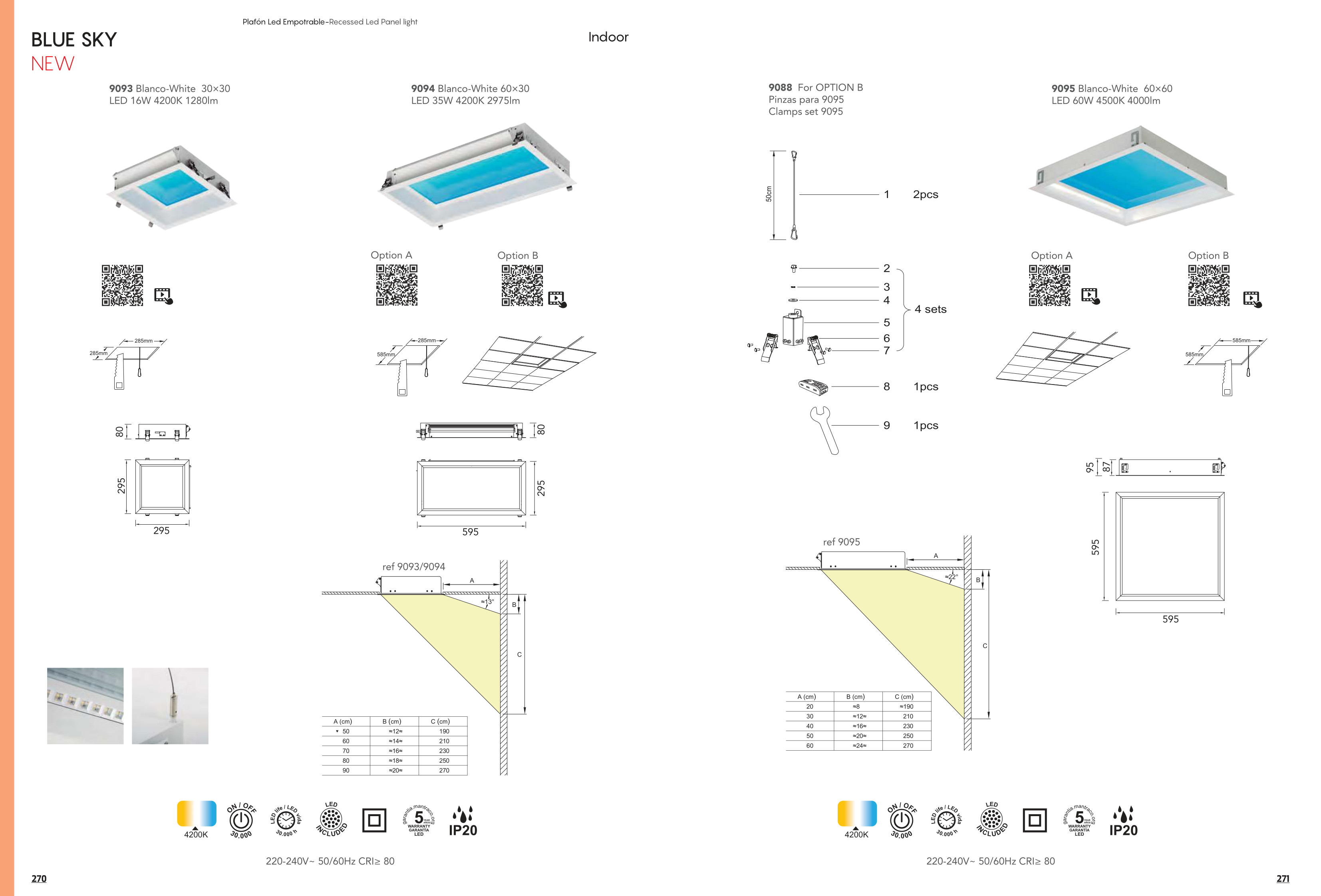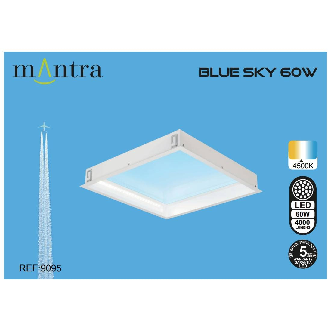 Лед плафон 9095 White 60W 4500K 4000lm BLUE SKY ще осигури комфорт и естетика във всяко помещение, в което се постави. Цялостната визия и дизайн на led лампата и вложените в изработката й материали, като алуминий с матово бяло покритие, асиметрична проекция на светлината, естествен ефект, напомнящ синьо небе в ясен ден, включени монтажни скоби за окачени тавани или гипскартон, ще допринесат за един неповторим стил. Благодарение на дългогодишния опит в производството на лед осветление, качествените материали и строгия контрол на качеството на изработка на производителя Mantra (Испания), 9095 White 60W 4500K 4000lm BLUE SKY е на високо европейско ниво.