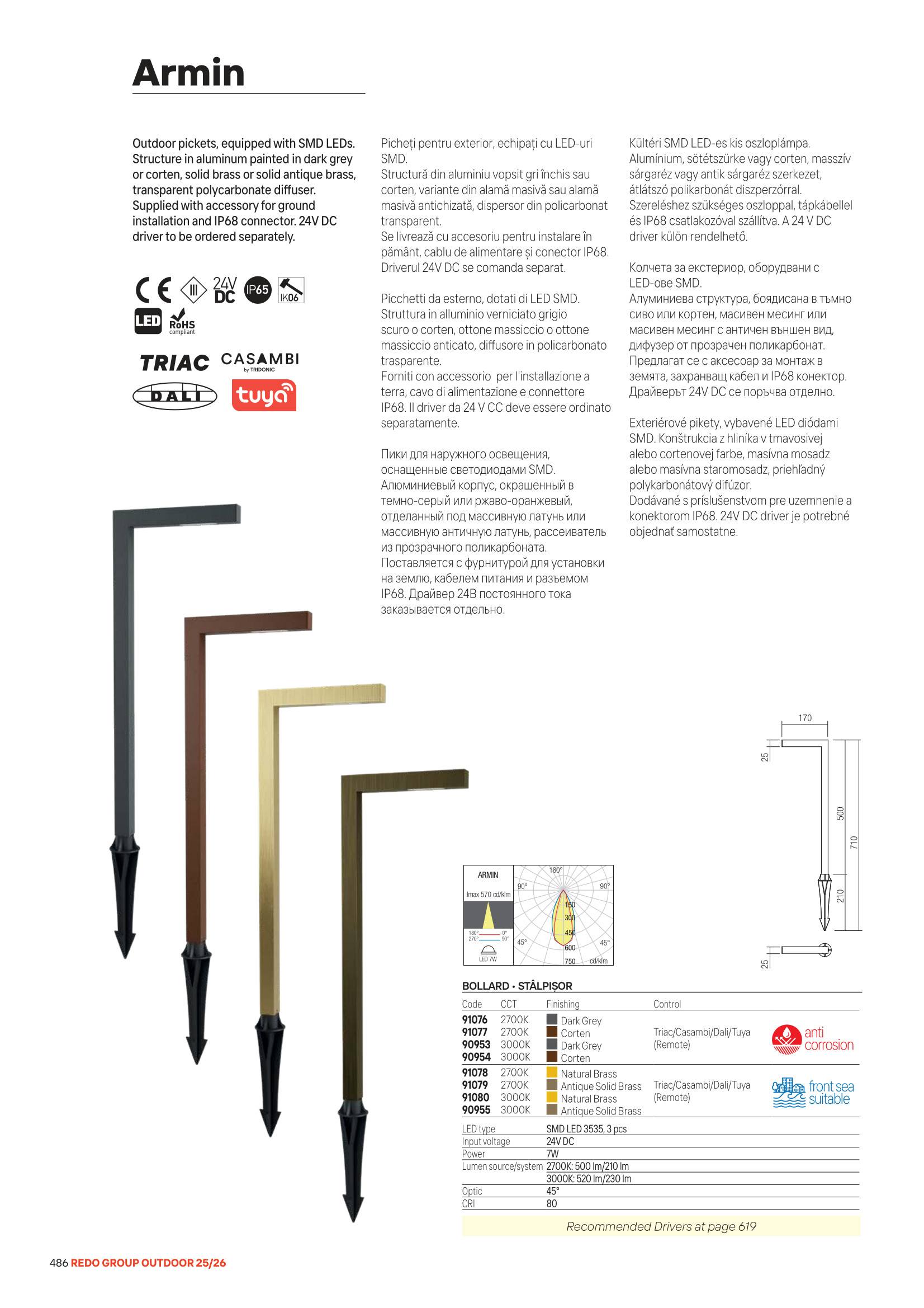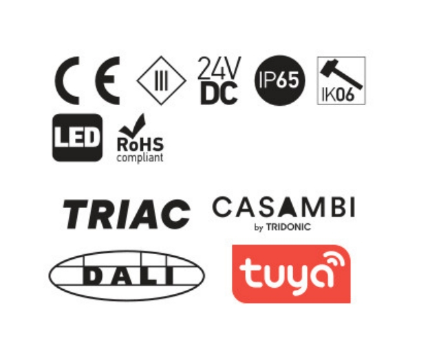 алуминий в цвят ръжда, дифузер от прозрачен поликарбонат, предлагат се с аксесоар за монтаж в земята, захранващ кабел и IP68 конектор, драйверът 24VDC се поръчва отделно