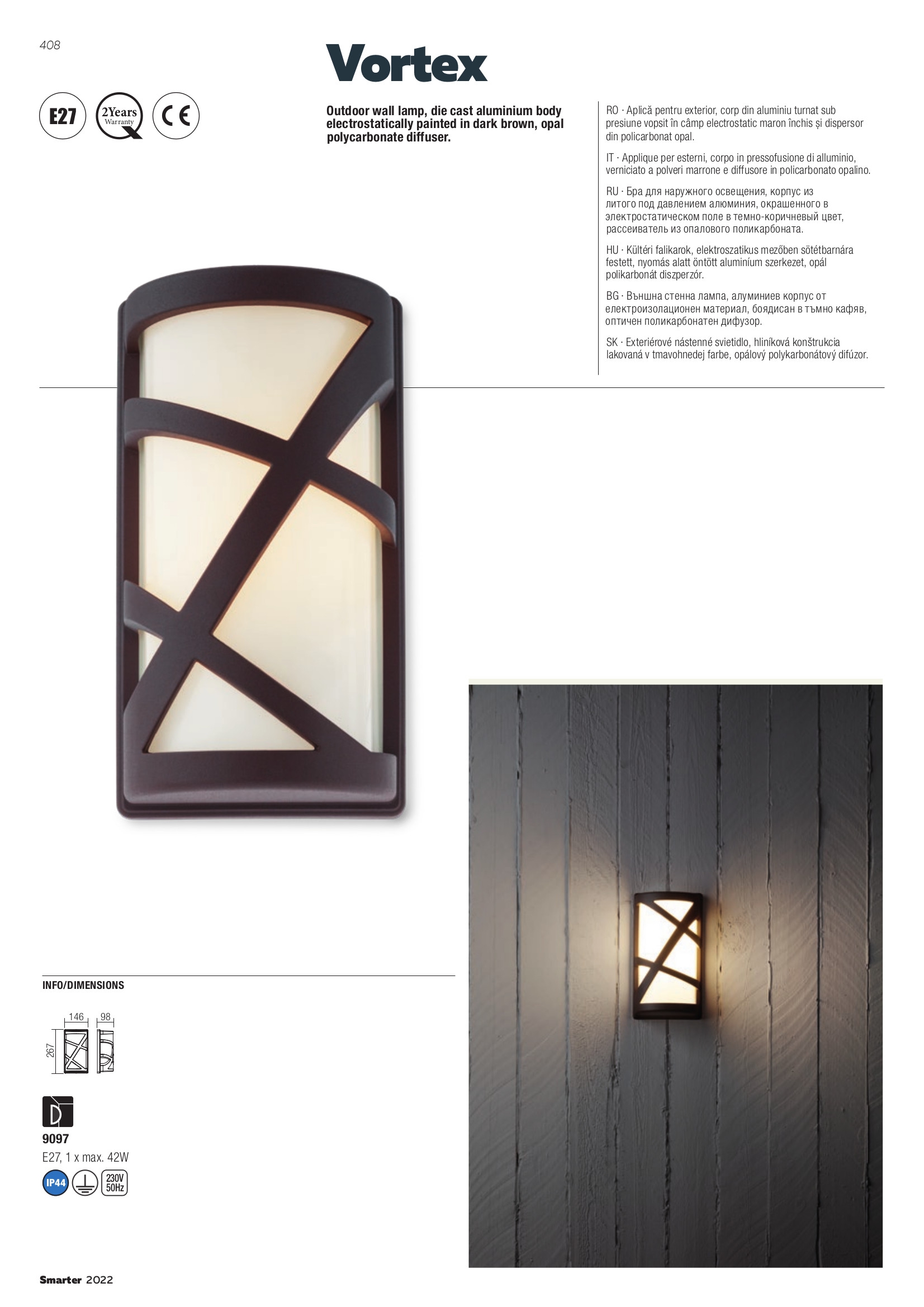 Осветителното тяло 9097 ще осигури комфорт и естетика във всяко помещение, в което се постави. Цялостната визия и дизайн на лампата и вложените в изработката й материали, като алуминий с тъмно кафяво покритие, нанесено в електростатично поле, дифузер от поликарбонат в опалово бяло, ще допринесат за един неповторим стил. Благодарение на дългогодишния опит, качествените материали и строгия контрол на качеството на изработка на дизайнерската линия Redo Smarter на производителя Redo (Румъния), 9097 е на високо европейско ниво.