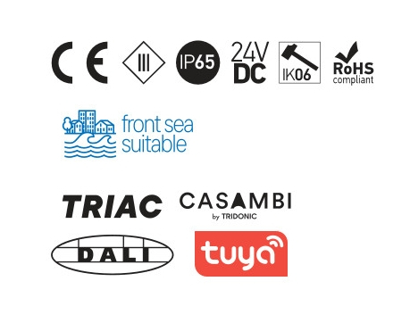 масивен месинг с покритие с цвят античен месинг, дифузер от сатениран поликарбонат, драйверът 24VDC се поръчва отделно, димиране чрез Triac/Casambi/Dali/Tuya (Remote), възможност за монтаж по крайбрежието на морето