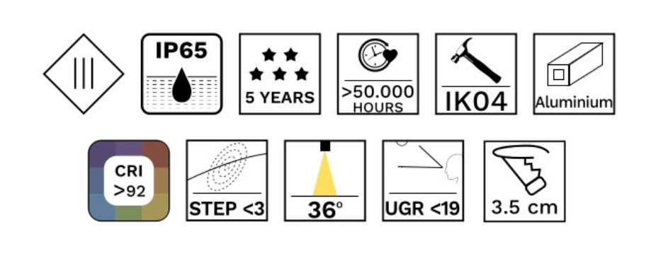 алуминий в бял цвят, драйвърът не е включен в комплекта, препоръчват се On/Off 9020170 или Dali 9844145 (remote), CRI>92, ъгъл на лъча 36°
