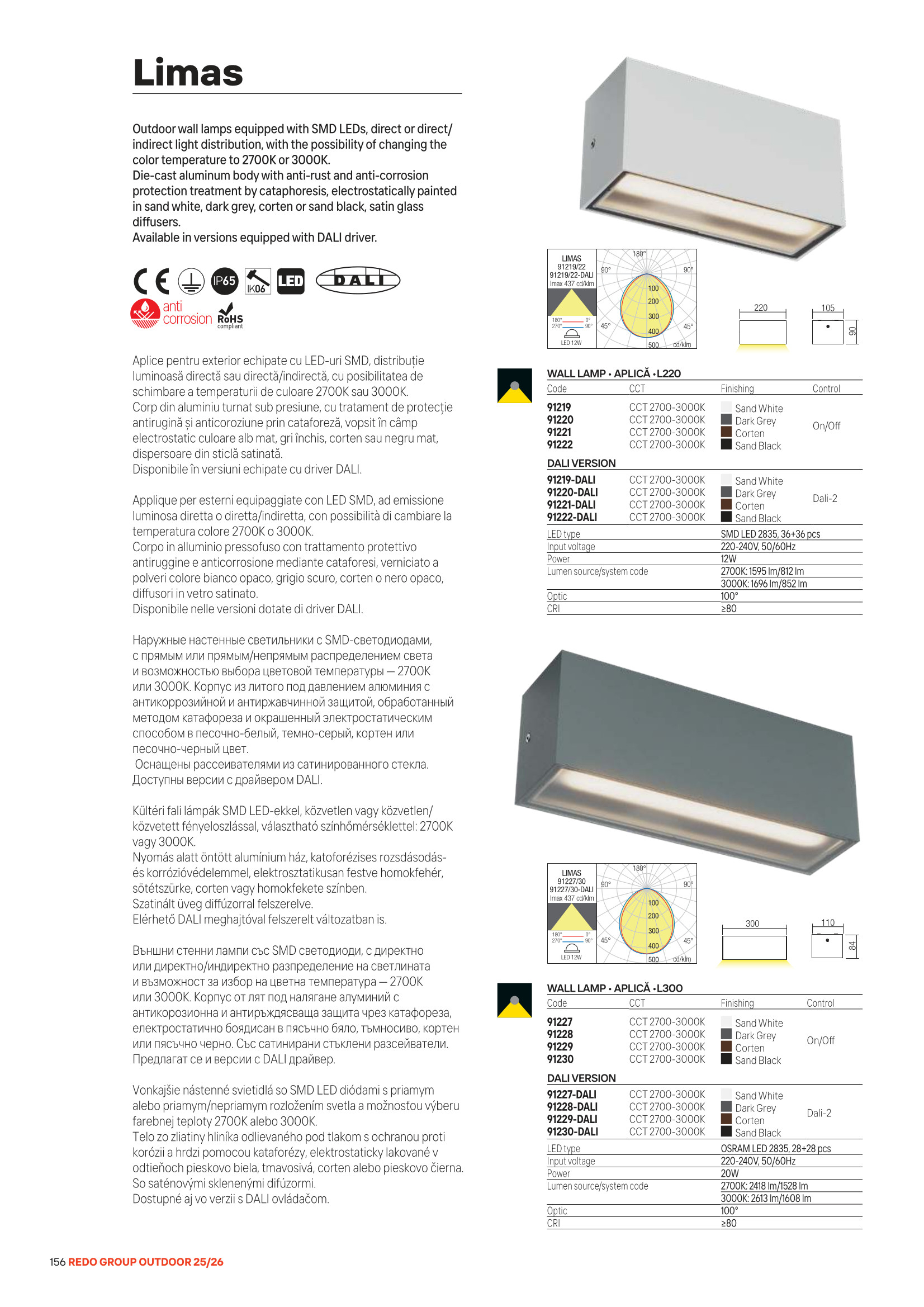 Лед аплик, външна лампа 91222 ще осигури комфорт и естетика във всяко помещение, в което се постави. Цялостната визия и дизайн на led лампата и вложените в изработката й материали, като отлят под налягане алуминий с антикорозионна и антиръждясваща защита чрез катафореза, с пясъчно черно покритие, сатенирани стъклени разсейватели, възможност за избор на цветна температура 2700K или 3000K, ще допринесат за един неповторим стил. Благодарение на дългогодишния опит в производството на лед осветление, качествените материали и строгия контрол на качеството на изработка на дизайнерската линия Redo Outdoor на производителя Redo (Румъния), 91222 е на високо европейско ниво.