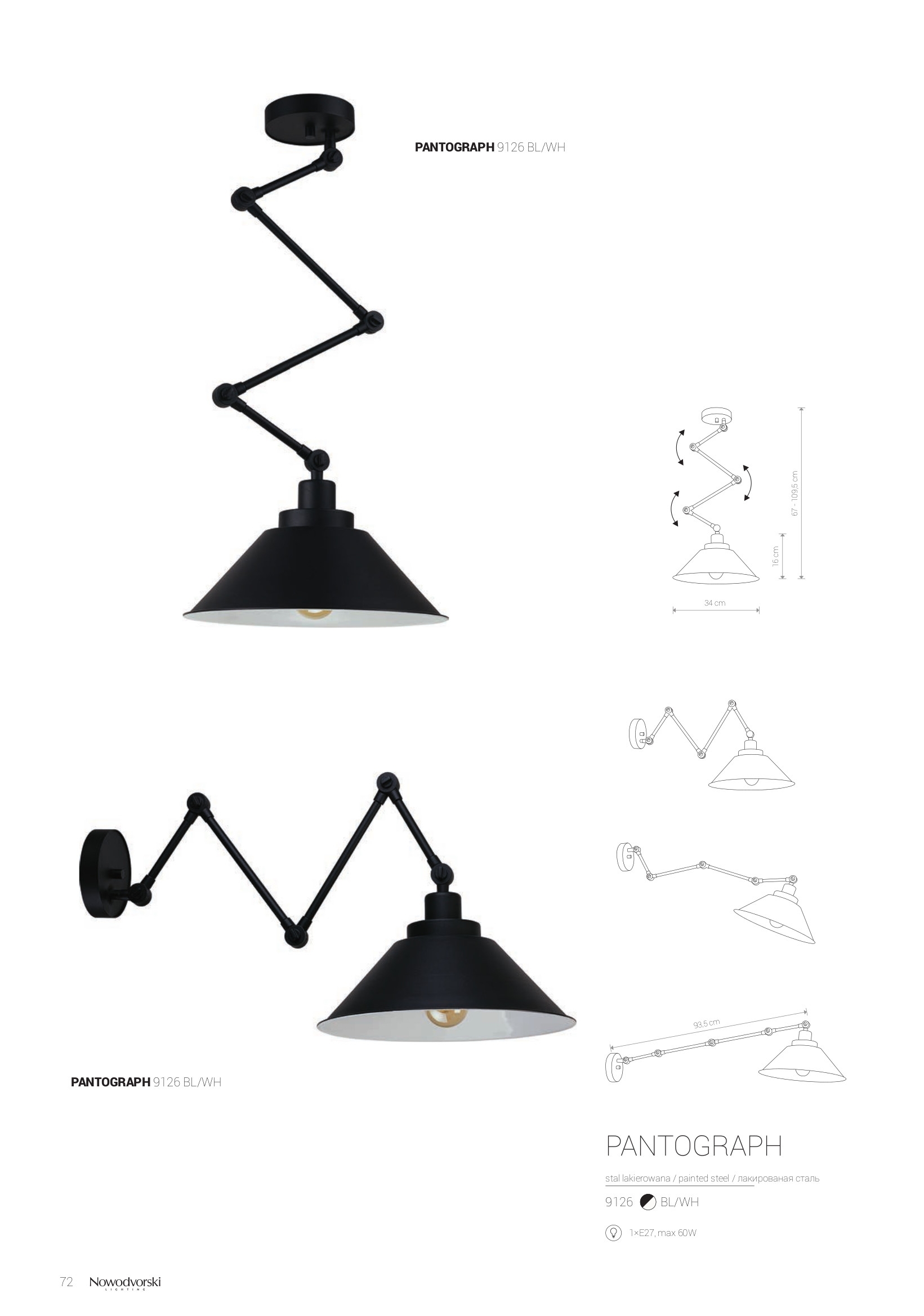 Осветителното тяло 9126 PANTOGRAPH ще осигури комфорт и естетика във всяко помещение, в което се постави. Цялостната визия и дизайн на лампата и вложените в изработката й материали, като стоманено регулируемо рамо в черно, конусовидна глава в черно/бяло, ще допринесат за един неповторим стил. Благодарение на дългогодишния опит, качествените материали и строгия контрол на качеството на изработка на производителя Nowodvorski (Полша), 9126 PANTOGRAPH е на високо европейско ниво.