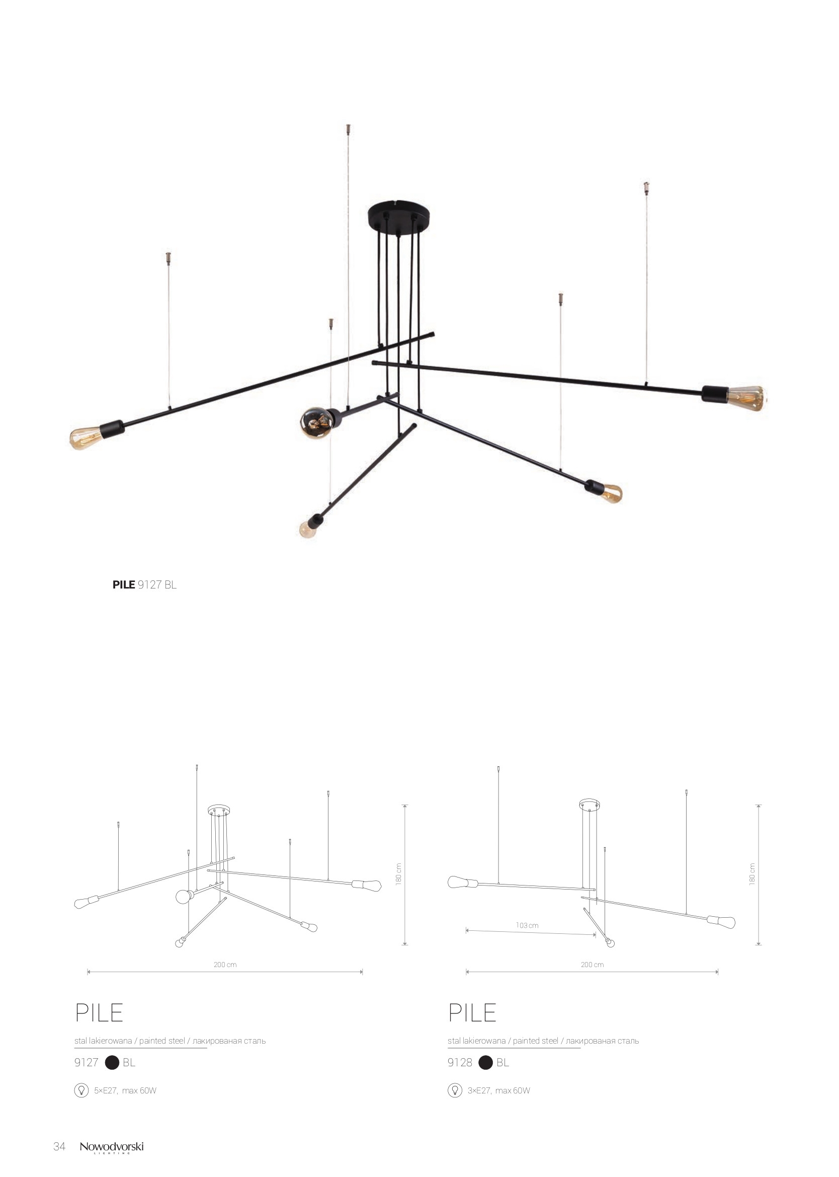 Осветителното тяло 9127 PILE V ще осигури комфорт и естетика във всяко помещение, в което се постави. Цялостната визия и дизайн на лампата и вложените в изработката й материали, като стомана в черен цвят, ще допринесат за един неповторим стил. Благодарение на дългогодишния опит, качествените материали и строгия контрол на качеството на изработка на производителя Nowodvorski (Полша), 9127 PILE V е на високо европейско ниво.