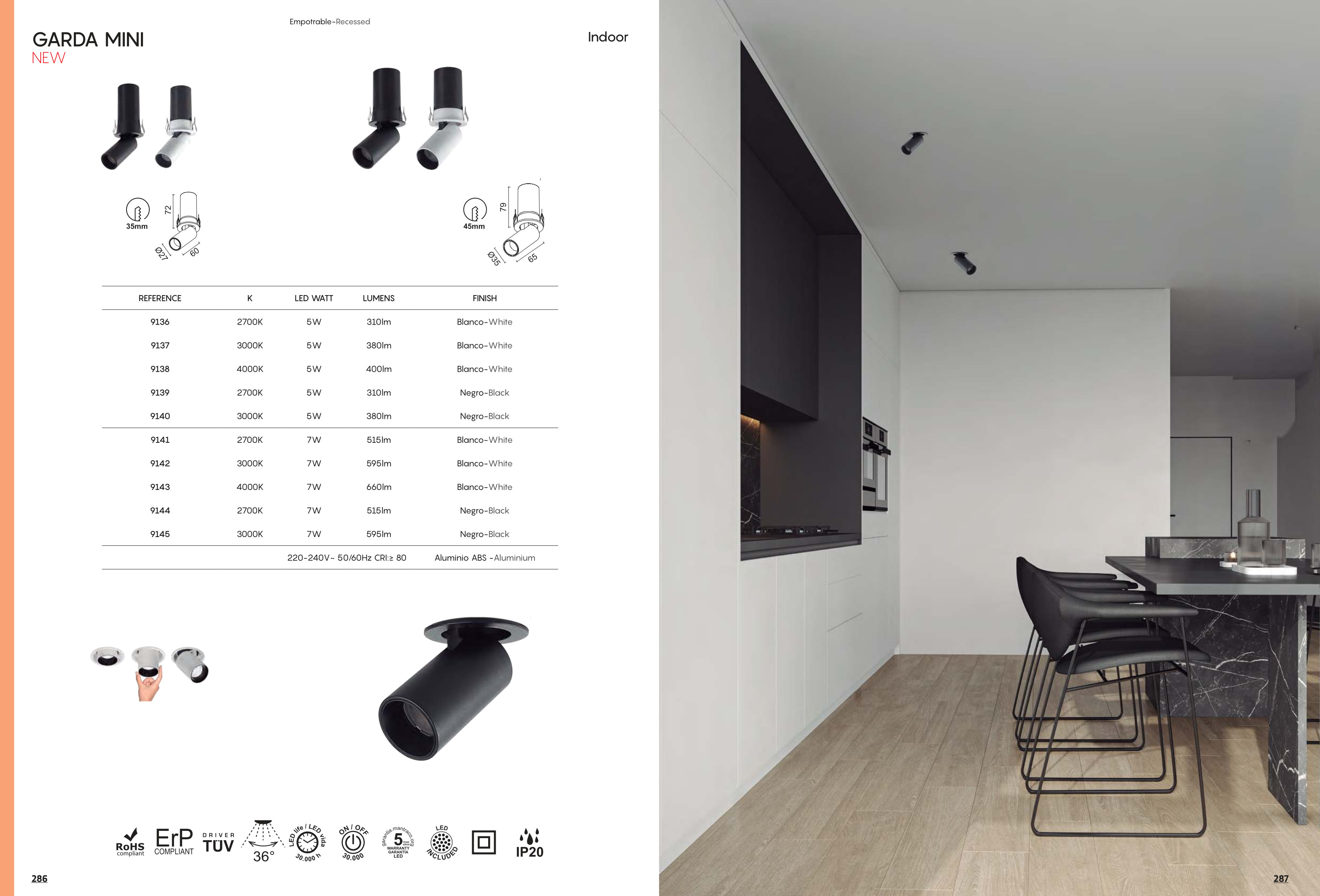 алуминий в бяло, полимер (ABS) в черно, регулируема глава, ъгъл на лъча 36°