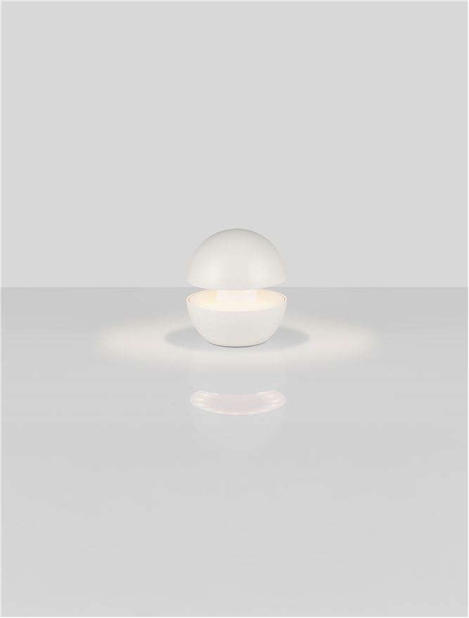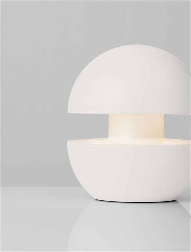 алуминий в матово бял цвят, полимер, ССТ 2200-2700-3000K, димиране чрез докосване, зареждане чрез база, включена в комплекта