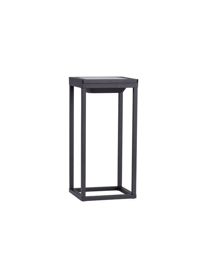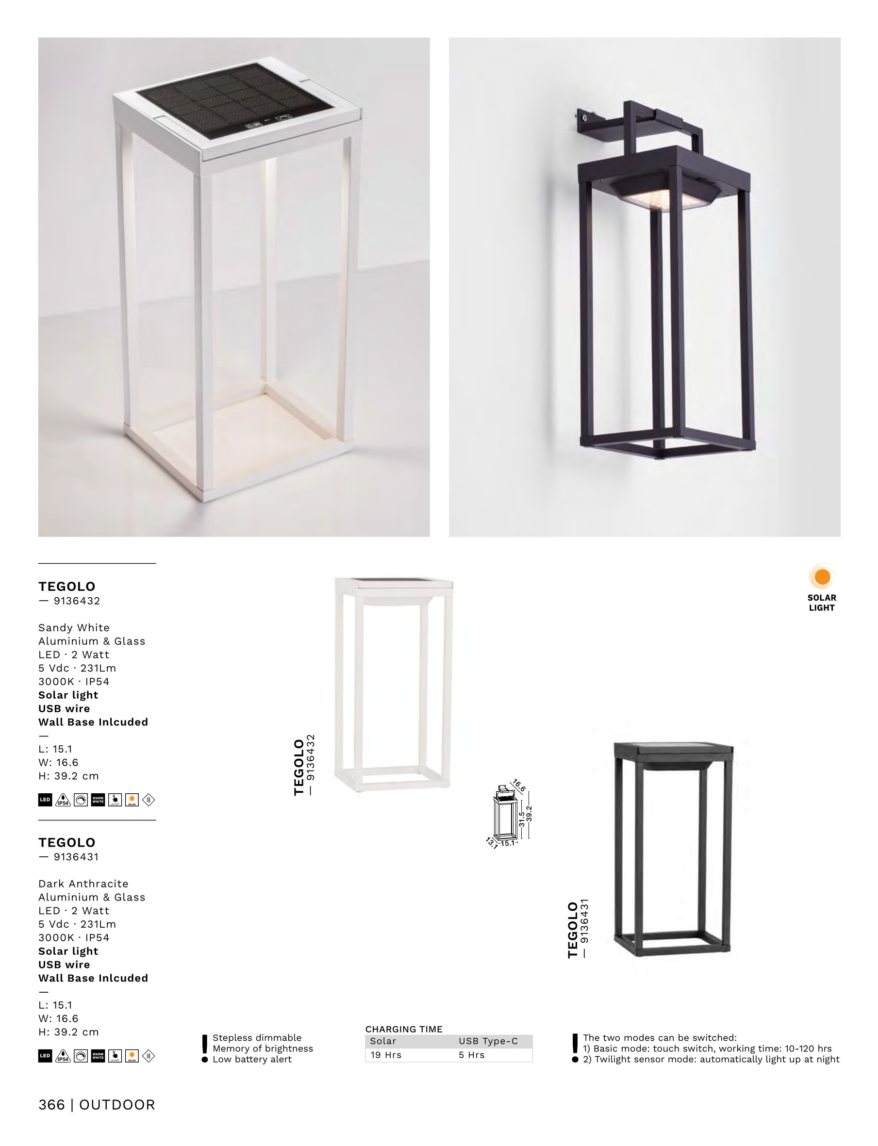 алуминий в матово черен цвят, соларна преносима лампа, зареждаема и с USB кабел с тип С 5 VDC накрайник, с два модела на работа - с докосване и чрез датчик на осветеност, държач за стена в камплекта