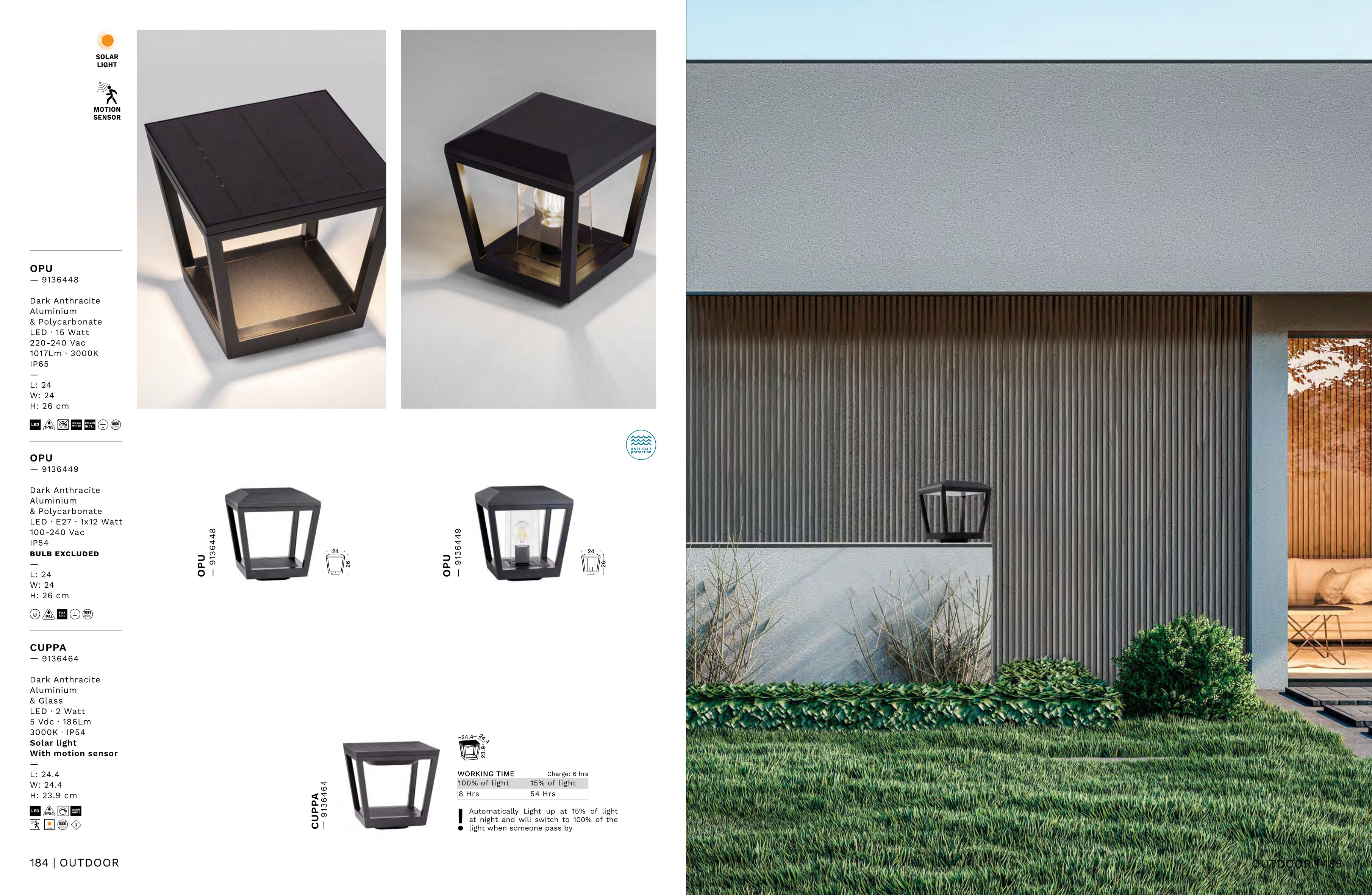 Осветителното тяло 9136464 ще осигури комфорт и естетика във всяко помещение, в което се постави. Цялостната визия и дизайн на лампата и вложените в изработката й материали, като алуминий в цвят тъмен антрацит, полимер, соларна лампа, сензор за движение, ще допринесат за един неповторим стил. Благодарение на дългогодишния опит, качествените материали и строгия контрол на качеството на изработка на производителя Nova-Luce (Гърция), 9136464 е на високо европейско ниво.