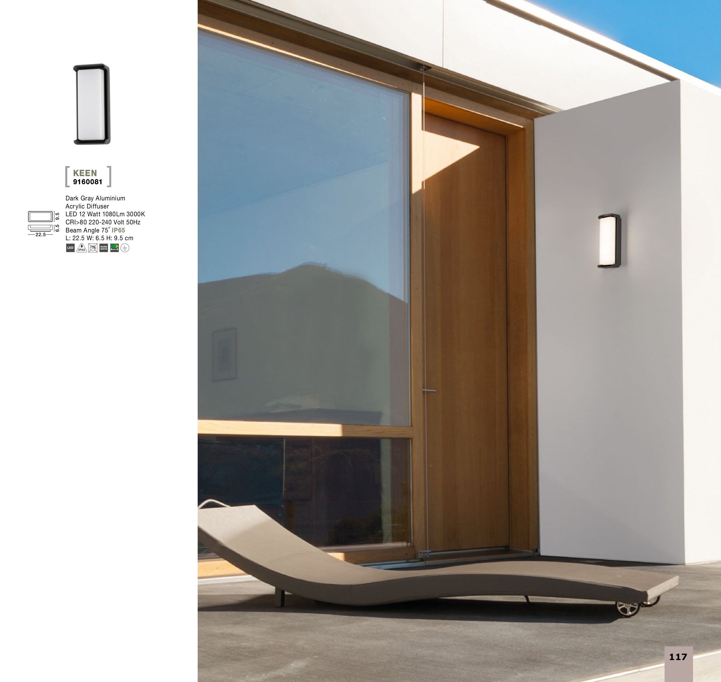 Осветителното тяло 9160081 представлява аплик, външна лампа в съвременен стил. 9160081 е от категорията осветителни тела и е подходящо за осветяване на различни помещения и пространства като: външно осветление, фасадно осветление.