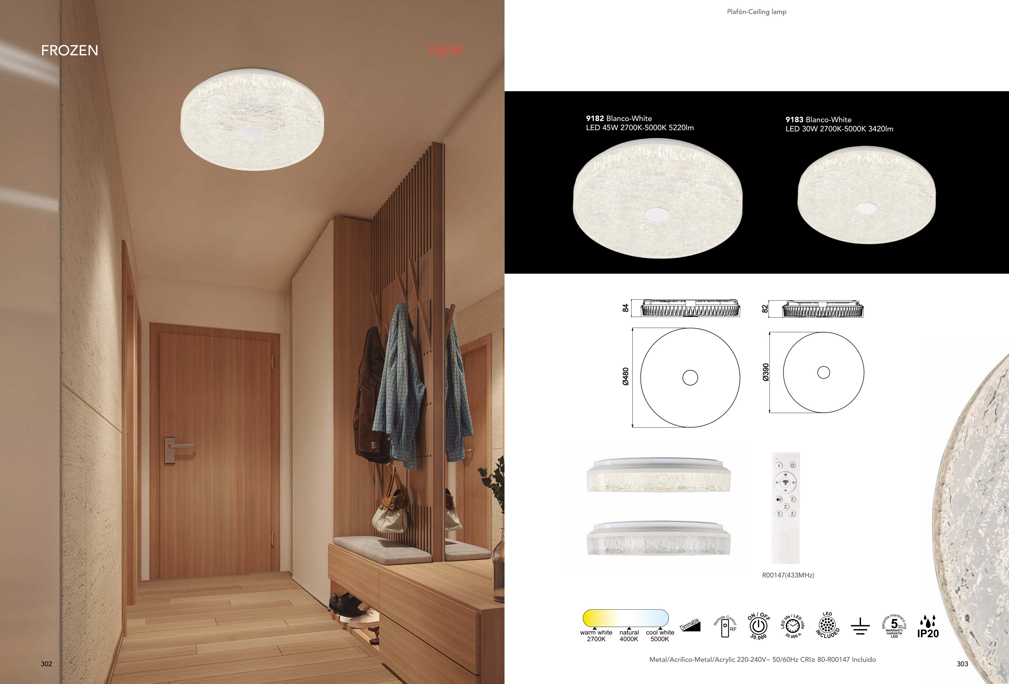 Лед плафон 9183 White FROZEN ще осигури комфорт и естетика във всяко помещение, в което се постави. Цялостната визия и дизайн на led лампата и вложените в изработката й материали, като метал в бяло, полимер с ефект на заледяване, димиране и контрол на цветната температура 2700-4000-5000К с дистанционно управление включено в комплекта, ще допринесат за един неповторим стил. Благодарение на дългогодишния опит в производството на лед осветление, качествените материали и строгия контрол на качеството на изработка на производителя Mantra (Испания), 9183 White FROZEN е на високо европейско ниво.