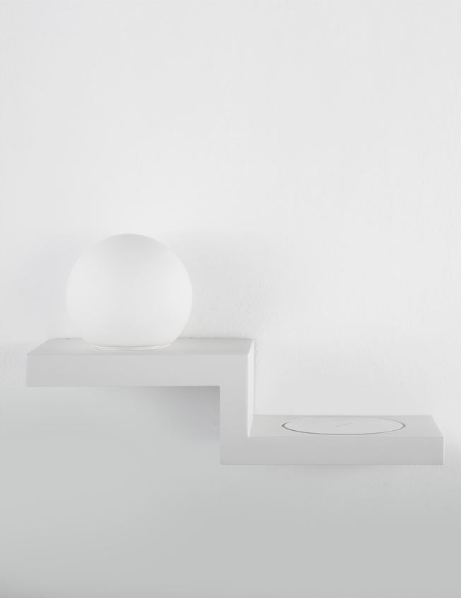 алуминий в бял цвят, опалово бяло стъкло, ключ ON/OFF, поставка за безжично зареждане на смартфон