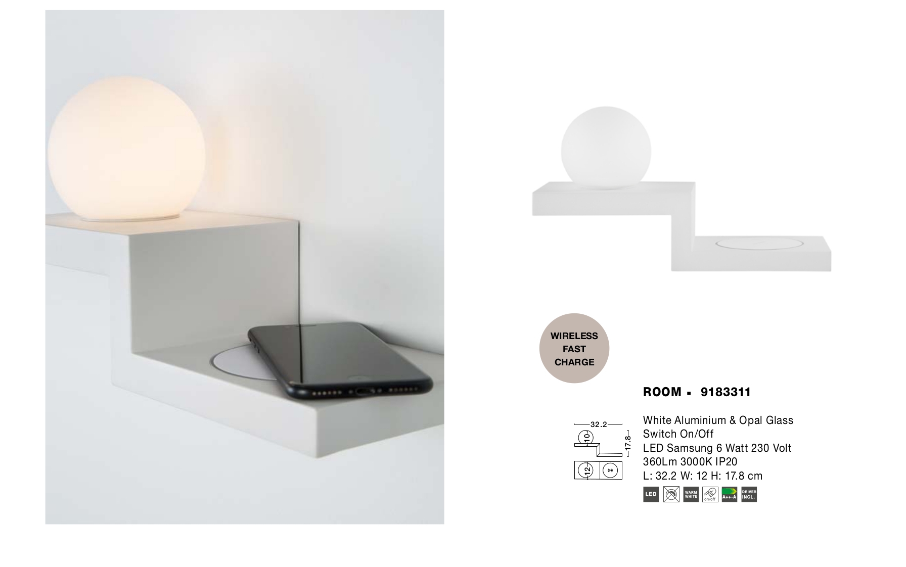 Лед аплик 9183311 ще осигури комфорт и естетика във всяко помещение, в което се постави. Цялостната визия и дизайн на led лампата и вложените в изработката й материали, като алуминий в бял цвят, опалово бяло стъкло, ключ ON/OFF, поставка за безжично зареждане на смартфон, ще допринесат за един неповторим стил. Благодарение на дългогодишния опит в производството на лед осветление, качествените материали и строгия контрол на качеството на изработка на производителя Nova-Luce (Гърция), 9183311 е на високо европейско ниво.