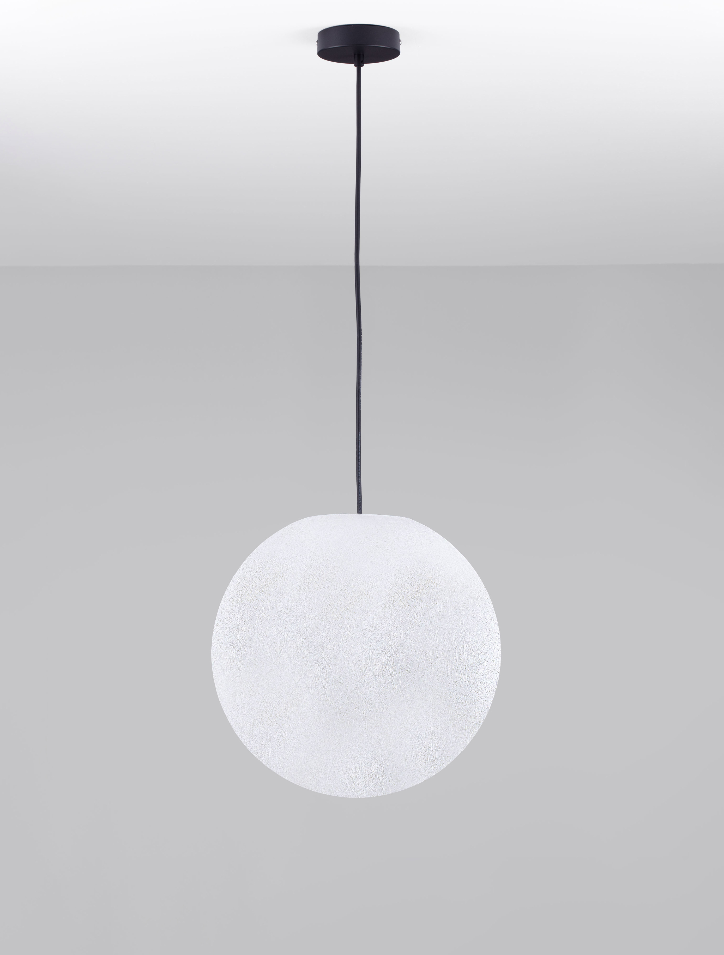 Стилът и естетиката на обстановката ще бъдат облагородени, както от цялостната визия и дизайн на осветителното тяло, така и от вложените в изработката на лампата висококачествени материали, като: текстура в бял цвят, черна метална розетка и черен кабел.