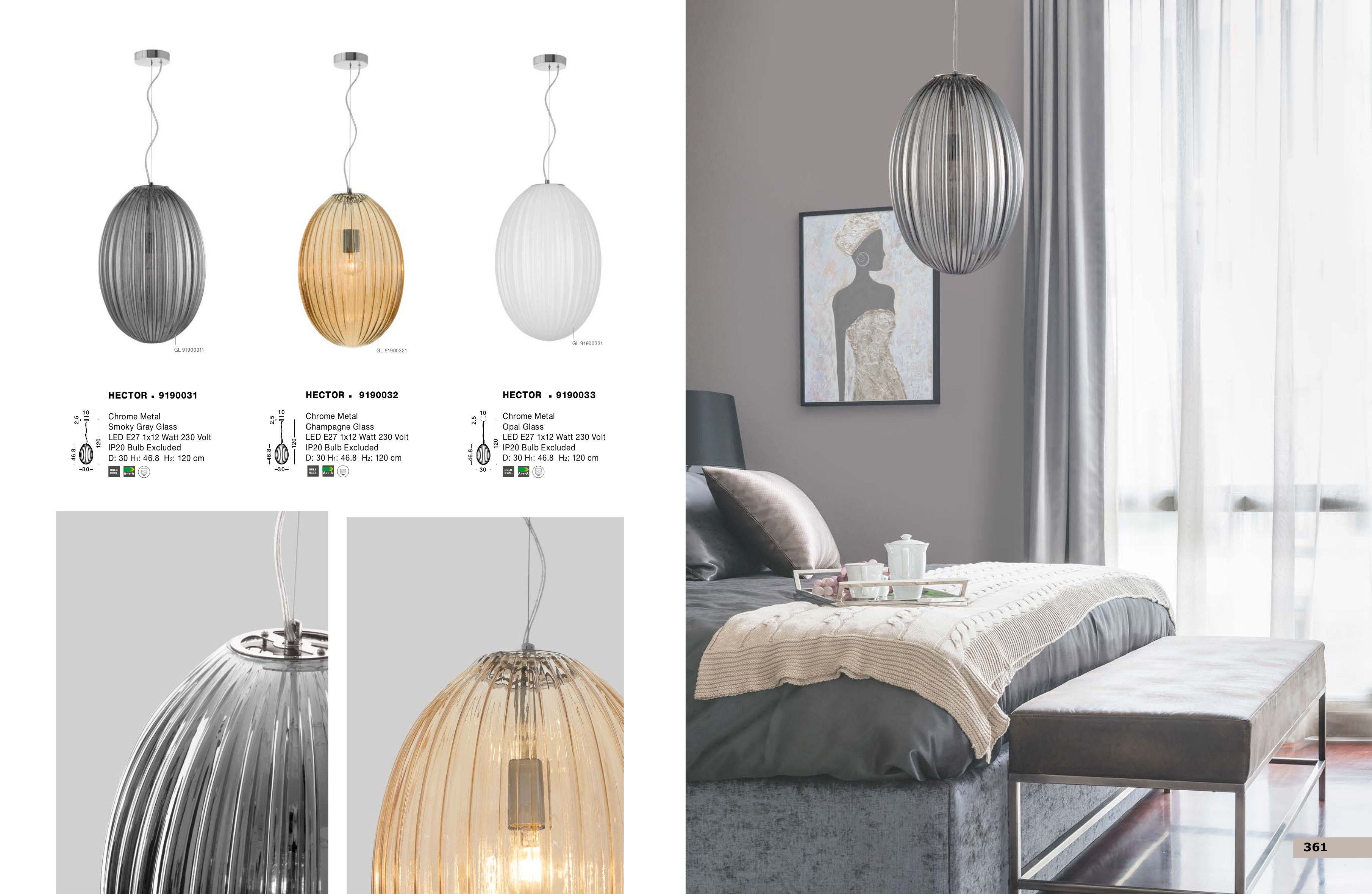 Осветителното тяло 9190031 ще осигури комфорт и естетика във всяко помещение, в което се постави. Цялостната визия и дизайн на лампата и вложените в изработката й материали, като хромиран метал, релефно стъкло в цвят опушено сиво, ще допринесат за един неповторим стил. Благодарение на дългогодишния опит, качествените материали и строгия контрол на качеството на изработка на производителя Nova-Luce (Гърция), 9190031 е на високо европейско ниво.