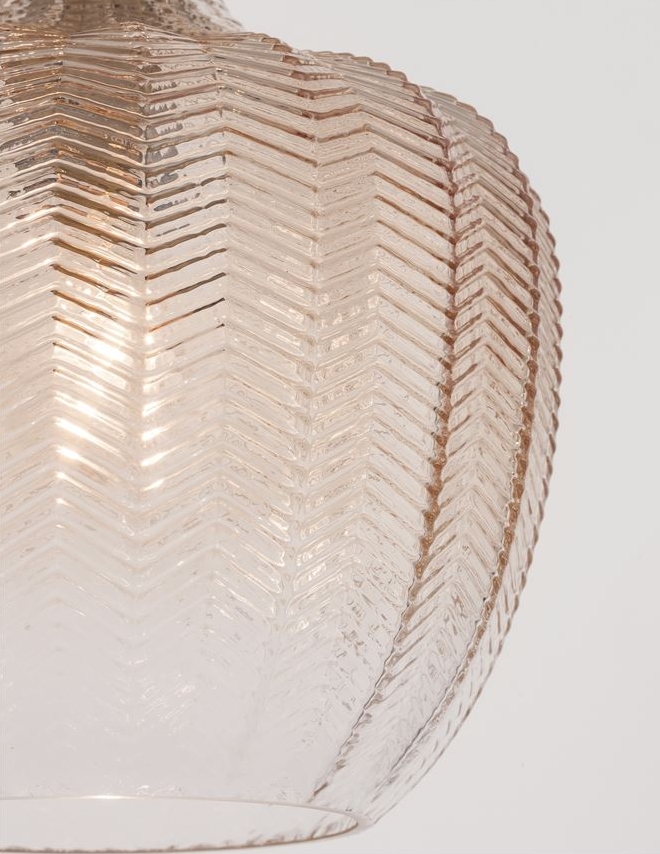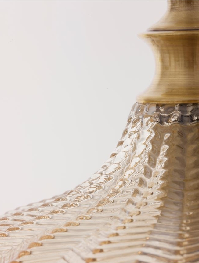 Стилът и естетиката на обстановката ще се обогатят благодарение, както на цялостната визия и дизайн на осветителното тяло, така и на вложените в изработката му, качествени материали, като: метал в цвят месинг, релефно стъкло в цвят шампанско.