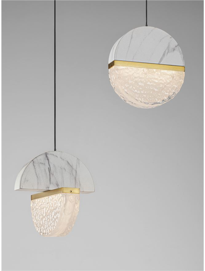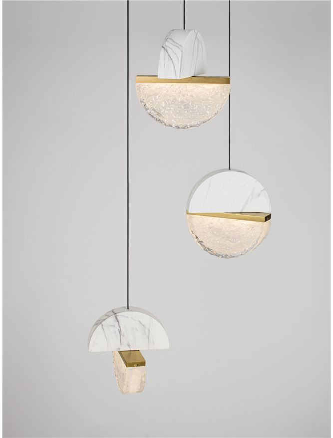 полупрозрачно бяло стъкло, бял мрамор, метал в цвят златен месинг, розетка от метал в матово черно