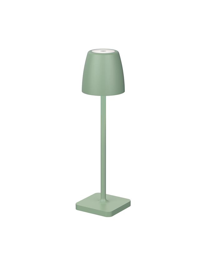 матово маслинено зелен отлят алуминий, полимер в бяло, ключ ON/OFF, зареждаема преносима лампа с USB кабел и адаптор, който се закупува отделно