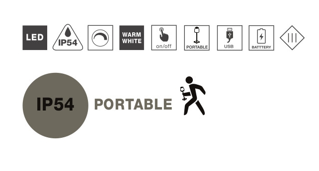 матов тъмно сив отлят алуминий, полимер в бяло, ключ ON/OFF, зареждаема преносима лампа с USB кабел и адаптор, който се закупува отделно