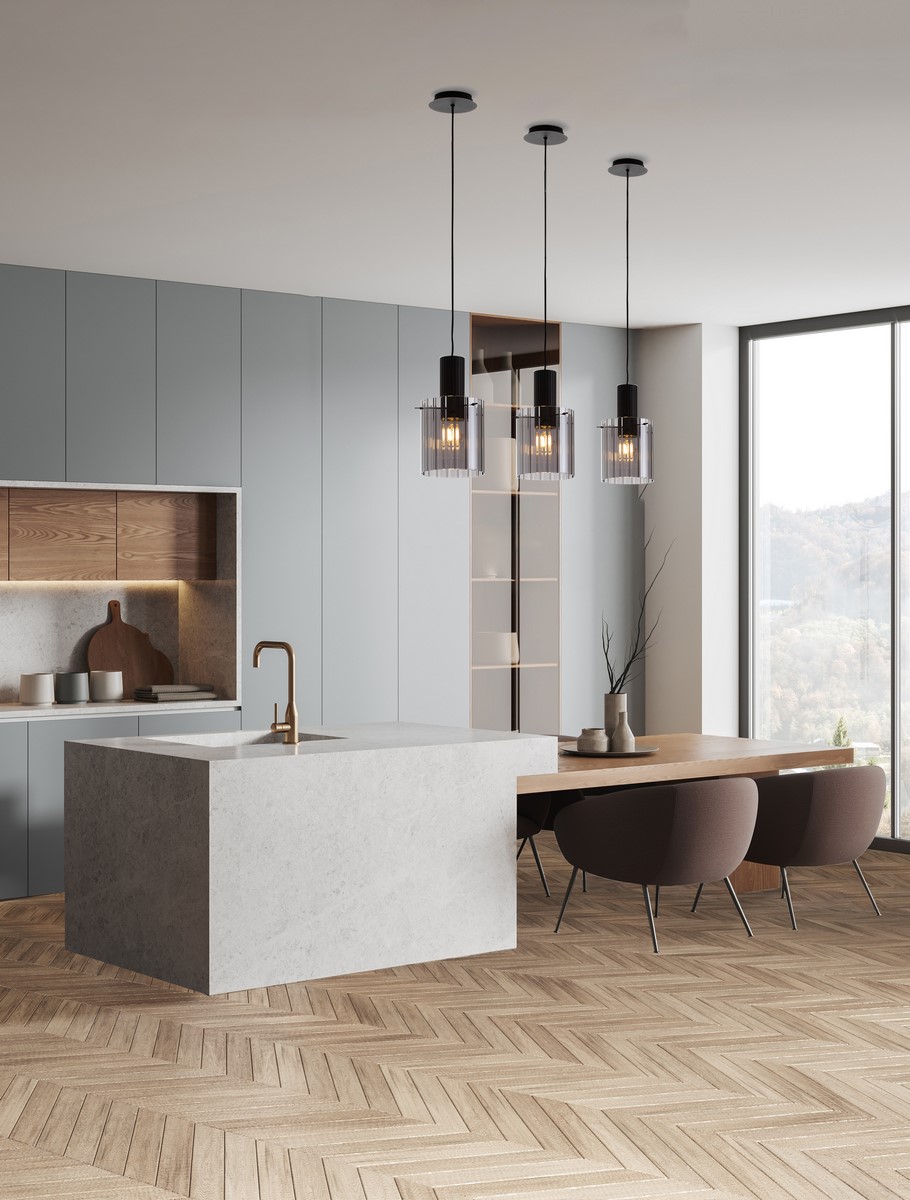 Стилът и естетиката на обстановката ще се обогатят благодарение, както на цялостната визия и дизайн на осветителното тяло, така и на вложените в изработката му, качествени материали, като: стомана в цвят черен мат, опушено в сиво стъкло.