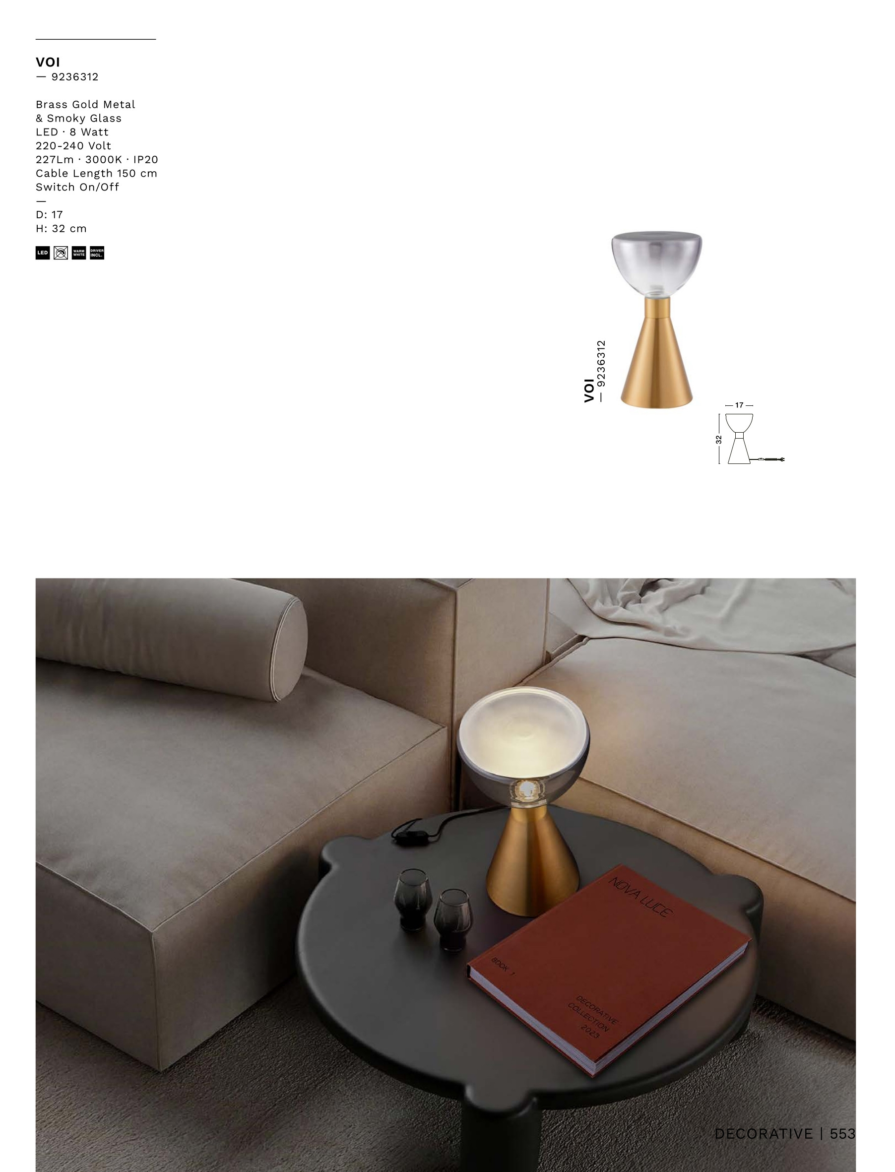 Лед настолна лампа 9236312 ще осигури комфорт и естетика във всяко помещение, в което се постави. Цялостната визия и дизайн на led лампата и вложените в изработката й материали, като метал в цвят златен месинг, опушено стъкло, захранващ кабел с щепсел и ключ ON/OFF, ще допринесат за един неповторим стил. Благодарение на дългогодишния опит в производството на лед осветление, качествените материали и строгия контрол на качеството на изработка на производителя Nova-Luce (Гърция), 9236312 е на високо европейско ниво.