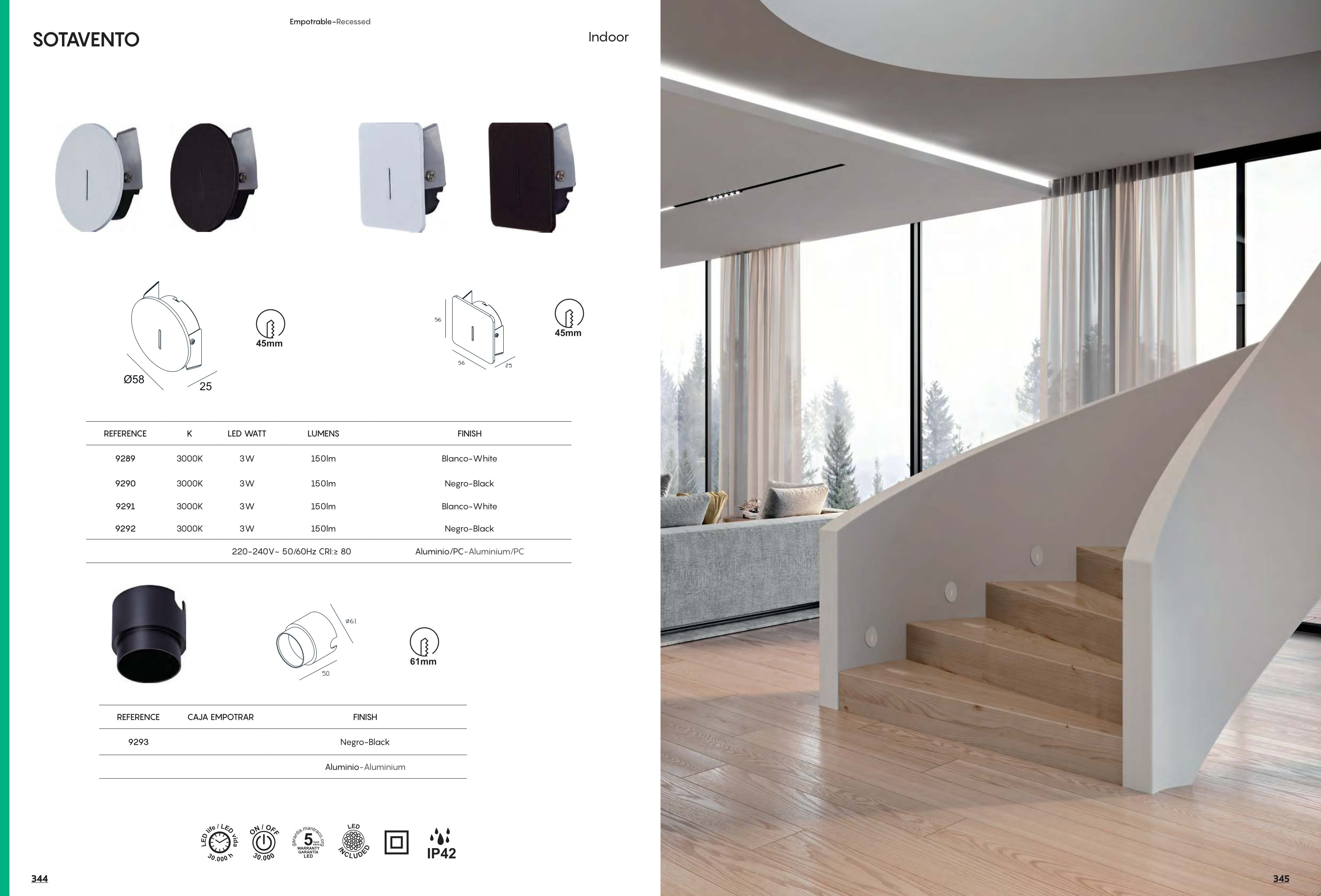 Осветителното тяло 9289 White 3W 3000K 150lm SOTAVENTO представлява лед аплик в съвременен стил. 9289 White 3W 3000K 150lm SOTAVENTO е от категорията и е подходящо за осветяване на различни помещения и пространства като: коридор, антре, стълбище, офис.
