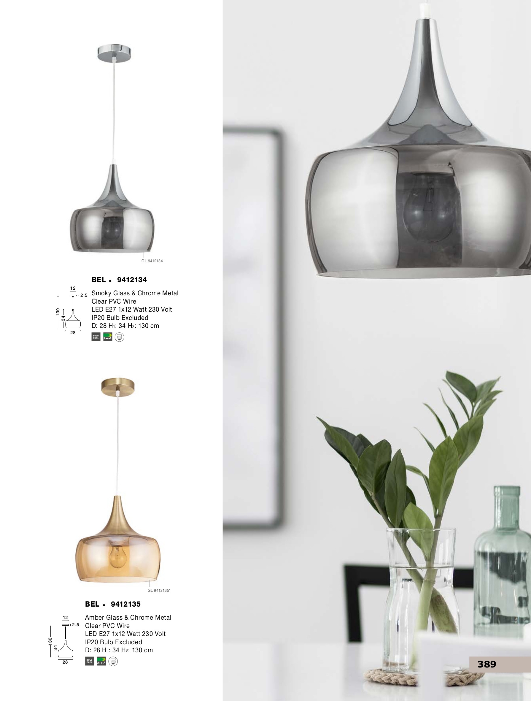 Стилът и естетиката на обстановката ще се обогатят благодарение, както на цялостната визия и дизайн на осветителното тяло, така и на вложените в изработката му, качествени материали, като: хромиран метал, стъкло в цвят кехлибар, прозрачен кабел от PVC.