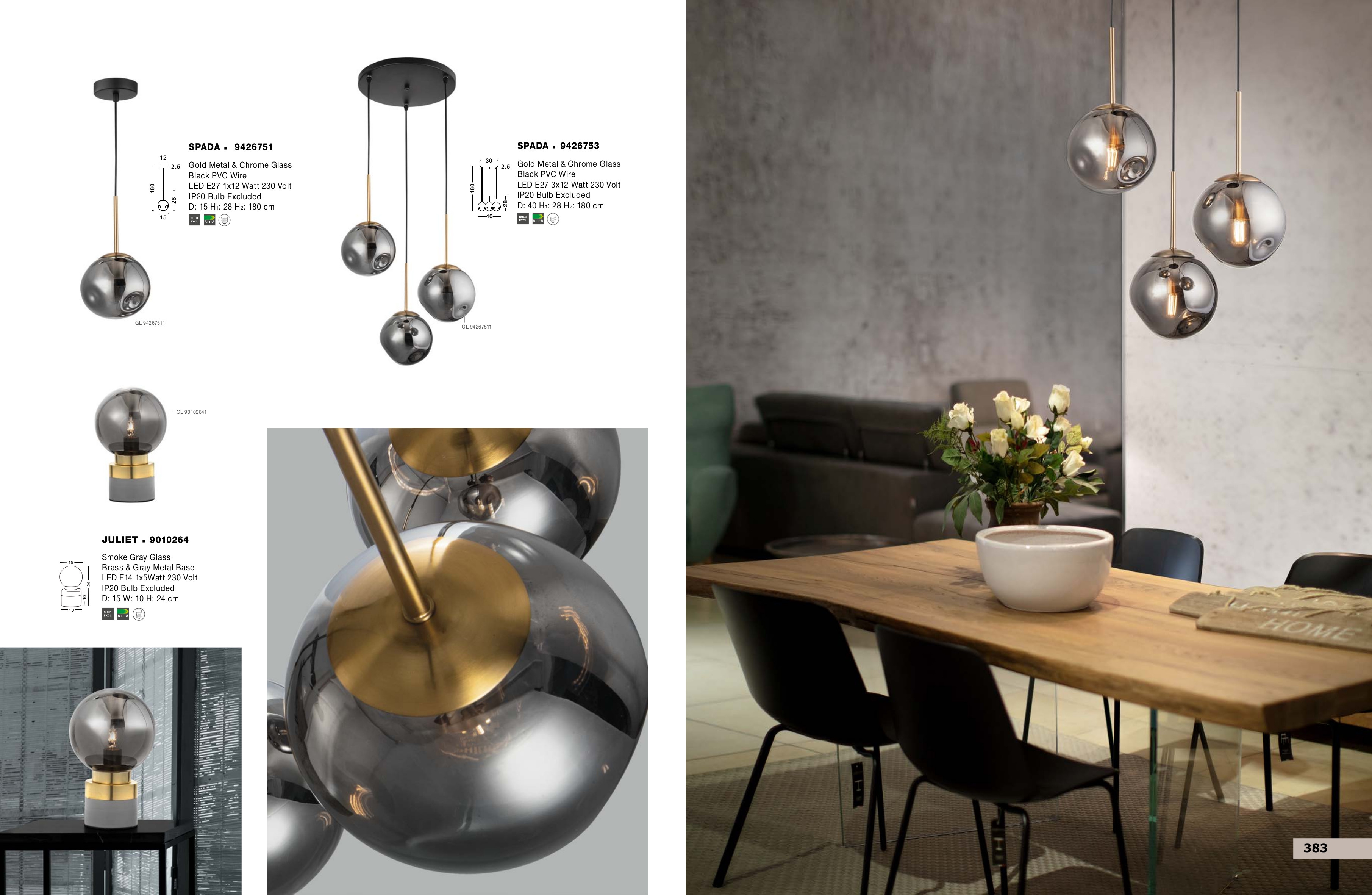 Стилът и естетиката на обстановката ще се обогатят благодарение, както на цялостната визия и дизайн на осветителното тяло, така и на вложените в изработката му, качествени материали, като: метал в цвят злато, хромирано стъкло, кабел от черно PVC.