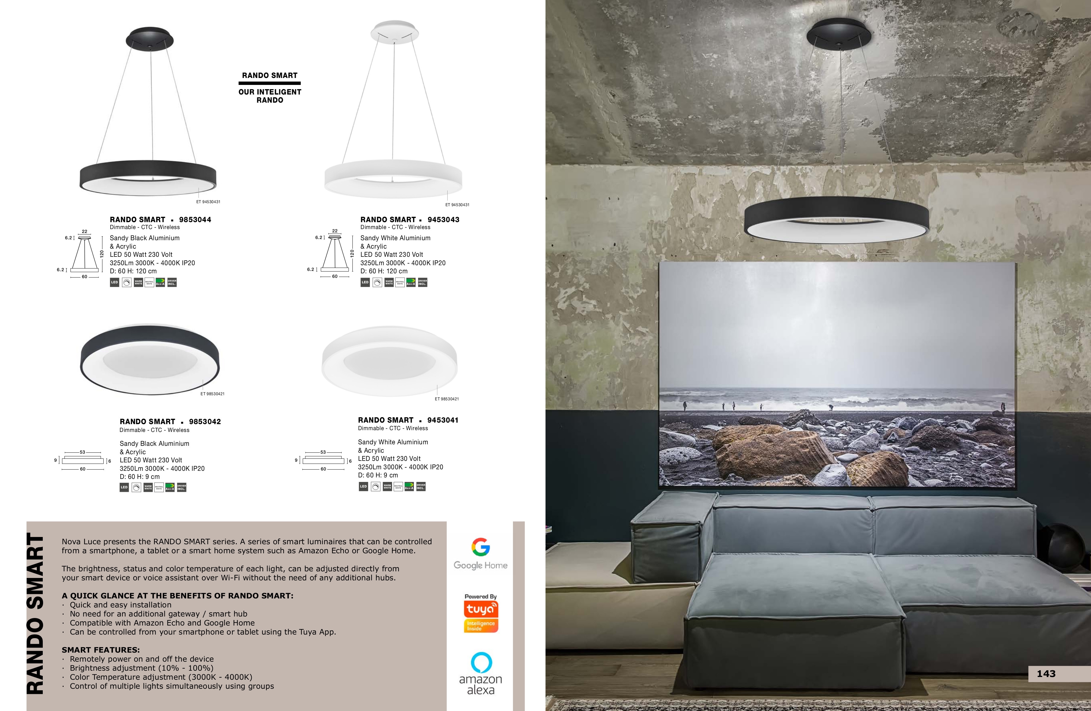 Осветителното тяло 9453043 ще осигури комфорт и естетика във всяко помещение, в което се постави. Цялостната визия и дизайн на лампата и вложените в изработката й материали, като алуминий в цвят бял мат, полимер в бяло, Wi-Fi контрол, ще допринесат за един неповторим стил. Благодарение на дългогодишния опит, качествените материали и строгия контрол на качеството на изработка на производителя Nova-Luce (Гърция), 9453043 е на високо европейско ниво.