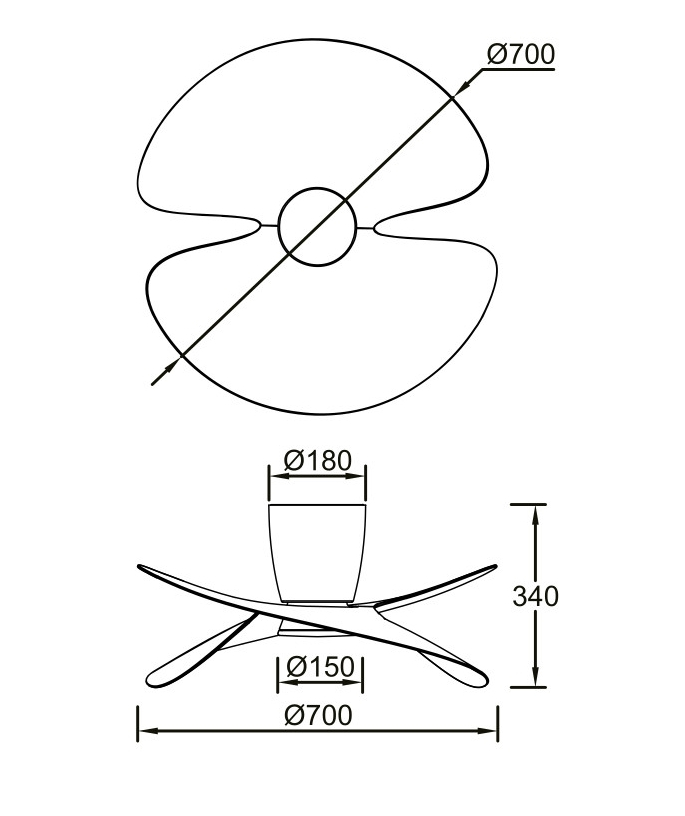 алуминий в черно, полимер в бяло, лопатки в цвят дърво, димиране, контрол на цветната температура 3000-5000K, посока на въртене и скорост се контролират от дистанционно включено в комплекта, DC двигател 30 W