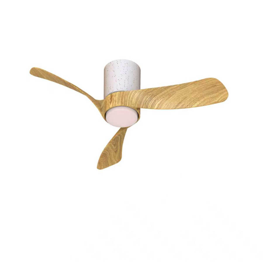 керамика в бял цвят, алуминий, полимер в бяло, перки в цвят светло дърво, включено в комплекта дистанционно, ССТ 3000-5000K, DC двигател 26W