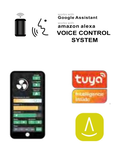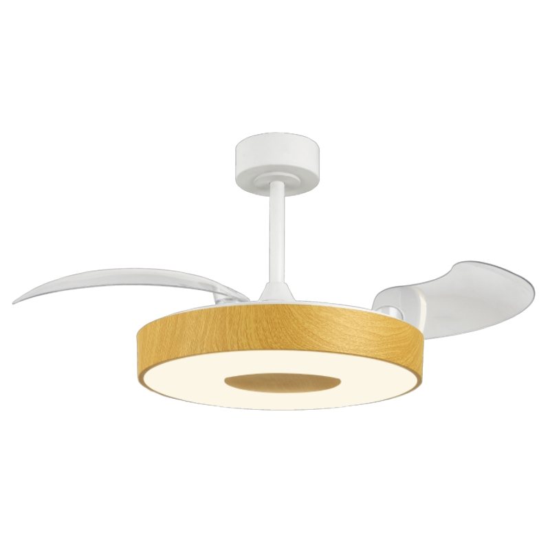 метал в бял цвят, ABS/PC в цвят светло дърво, прозрачни сгъваеми перки, контрол с дистанционно, с глас и приложение за смартфон