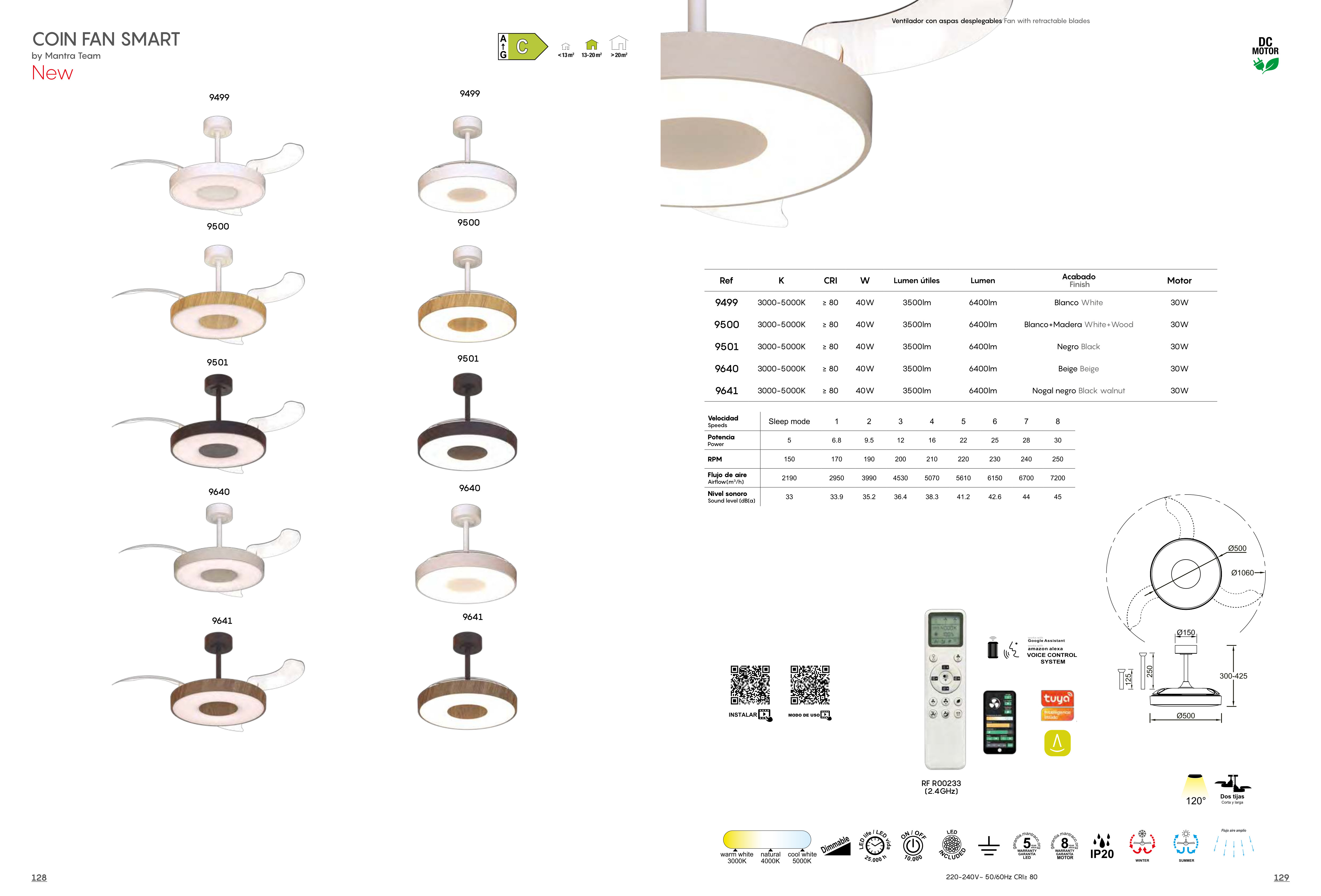 Лед плафон 9500 White+Wood LED Fan Ceiling + Tuya COIN FAN SMART ще осигури комфорт и естетика във всяко помещение, в което се постави. Цялостната визия и дизайн на led лампата и вложените в изработката й материали, като метал в бял цвят, ABS/PC в цвят светло дърво, прозрачни сгъваеми перки, контрол с дистанционно, с глас и приложение за смартфон, ще допринесат за един неповторим стил. Благодарение на дългогодишния опит в производството на лед осветление, качествените материали и строгия контрол на качеството на изработка на производителя Mantra (Испания), 9500 White+Wood LED Fan Ceiling + Tuya COIN FAN SMART е на високо европейско ниво.