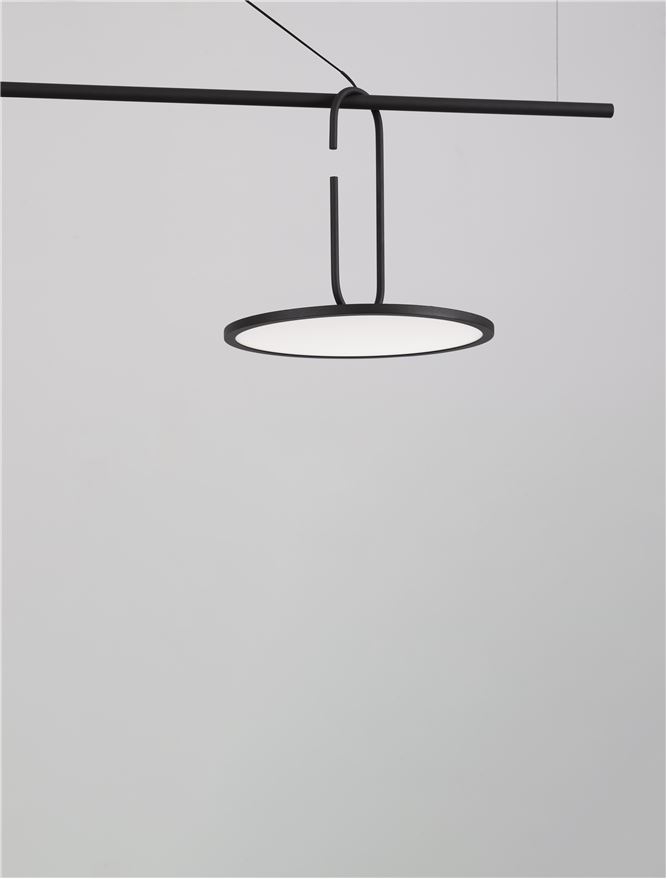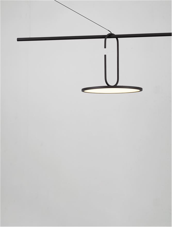 стомана в черен цвят, алуминий в черно, полимер в бяло, светлинният източник може да се придвижва по хоризонталният елемент на конструкцията