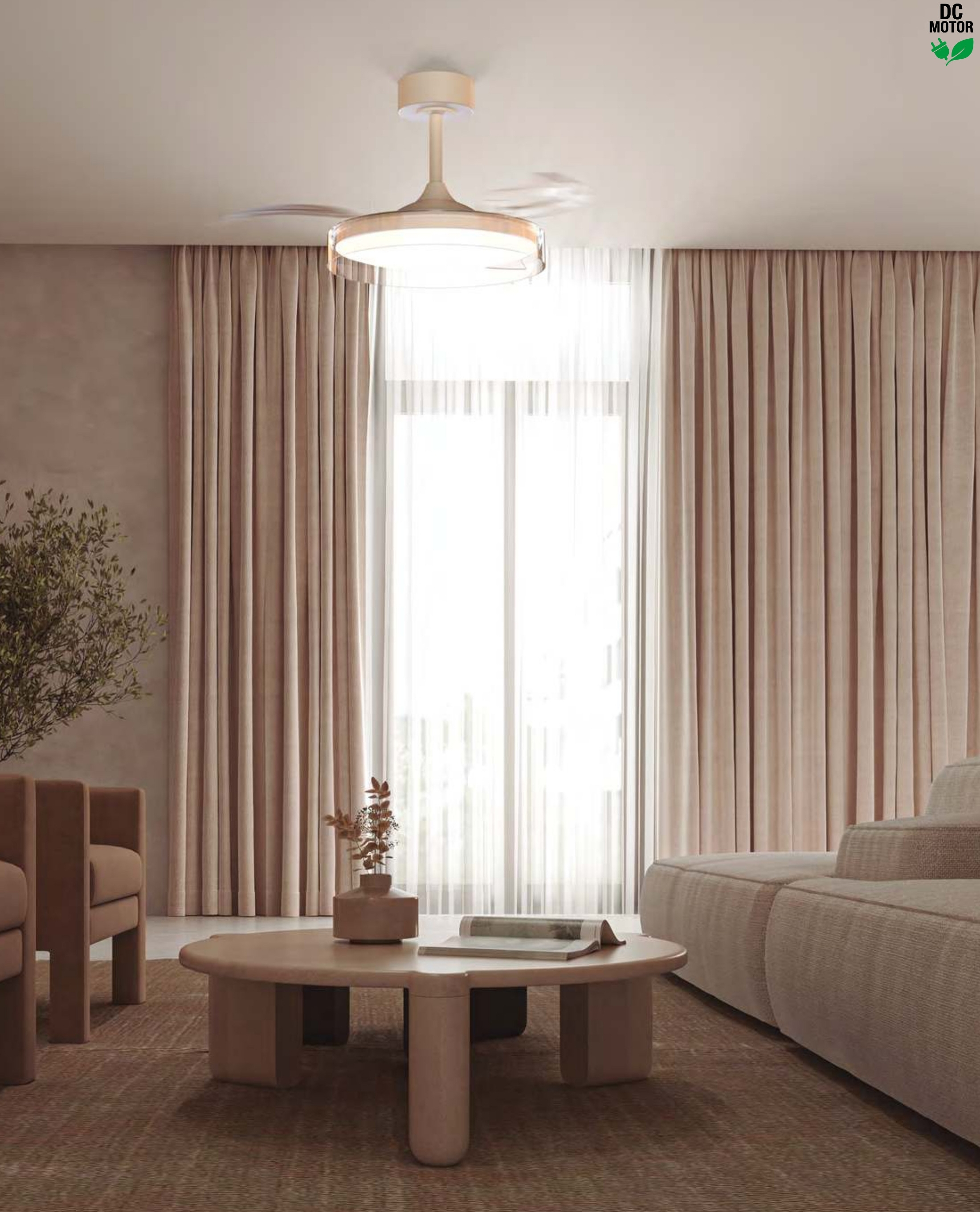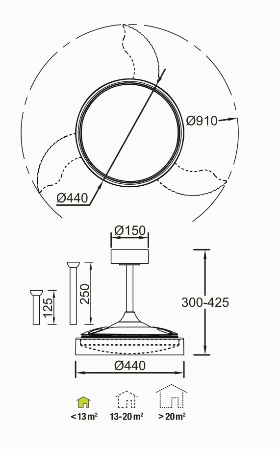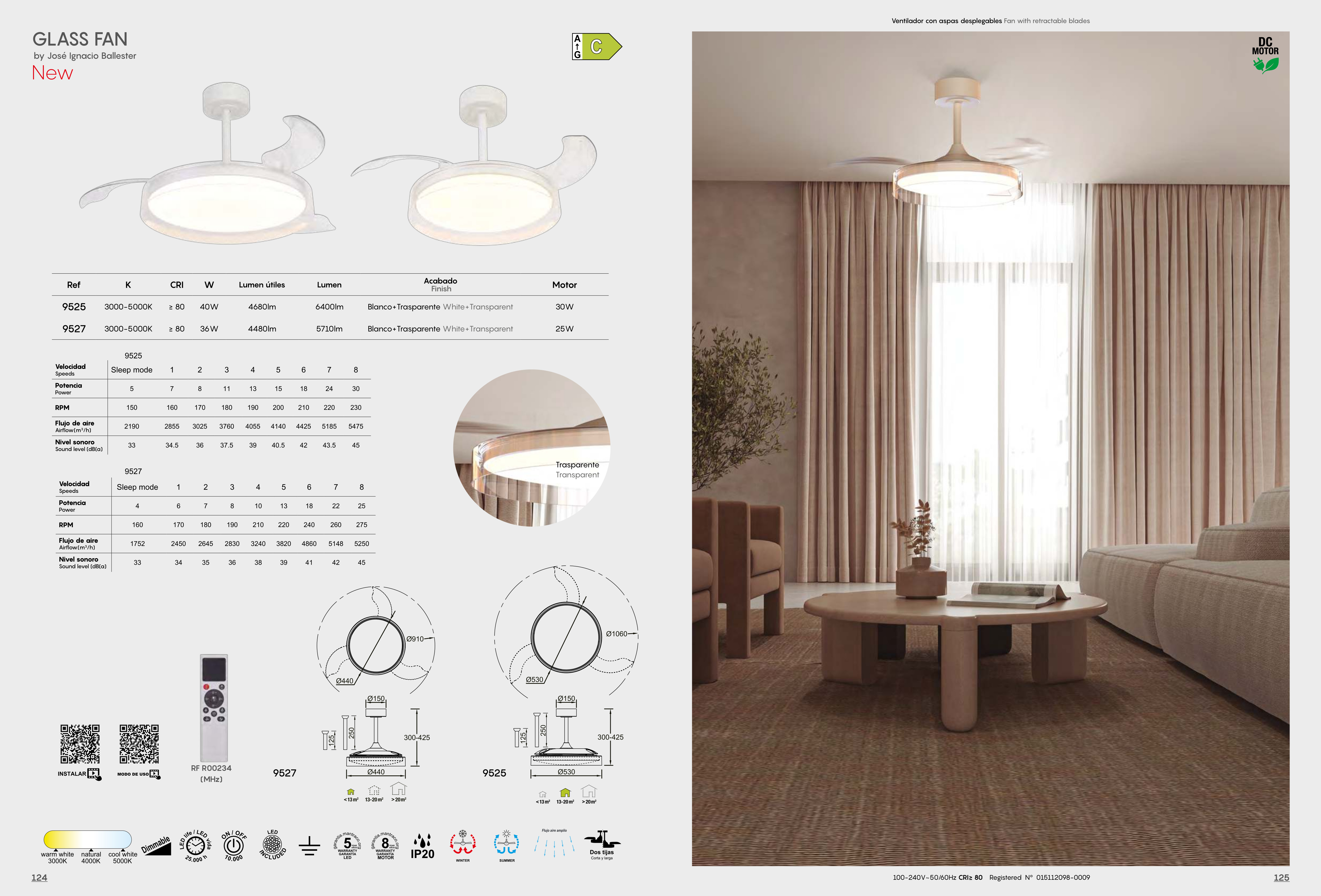 метал и полимер в бял цвят, прозрачни перки от PS, дистанционно за определяне на цветната температура, димиране, смяна посоката и скороста на въртене, DC двигател 30 W