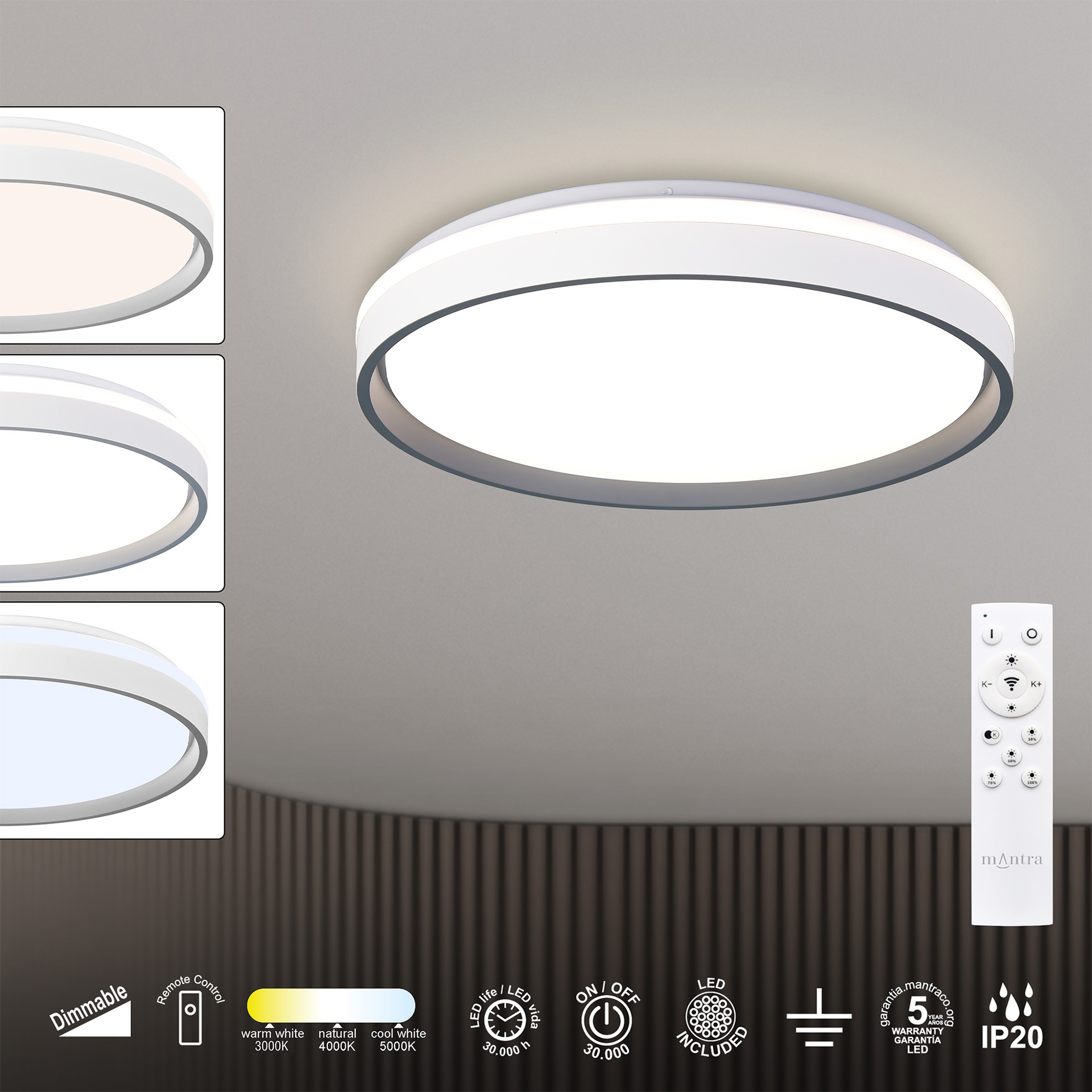 алуминий в бял цвят, сиво отвэтре, полимер в бяло, дистанционно управление за димиране и контрол на цветната температура 3000K-5000K