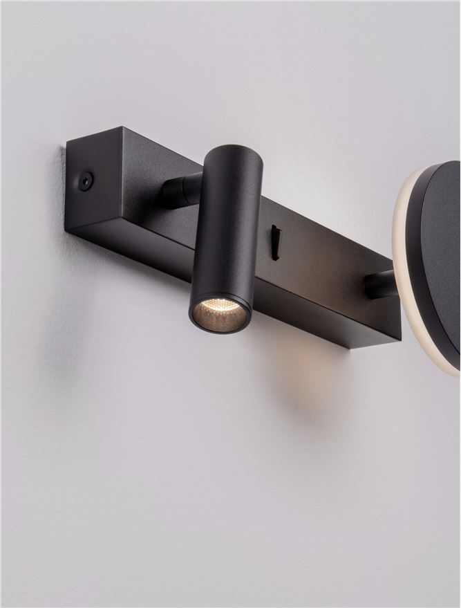 алуминий и стомана в пясъчно черен цвят, индиректна и директна, насочваща се светлина, два превключвателя ON/OFF, интегрирани в корпуса