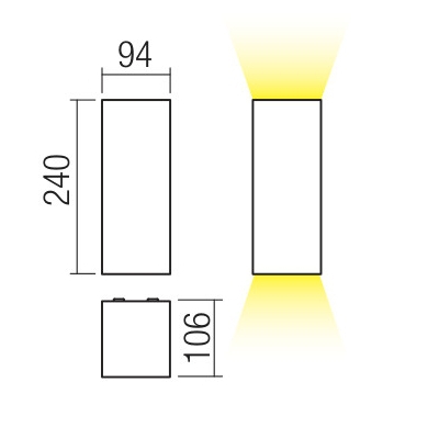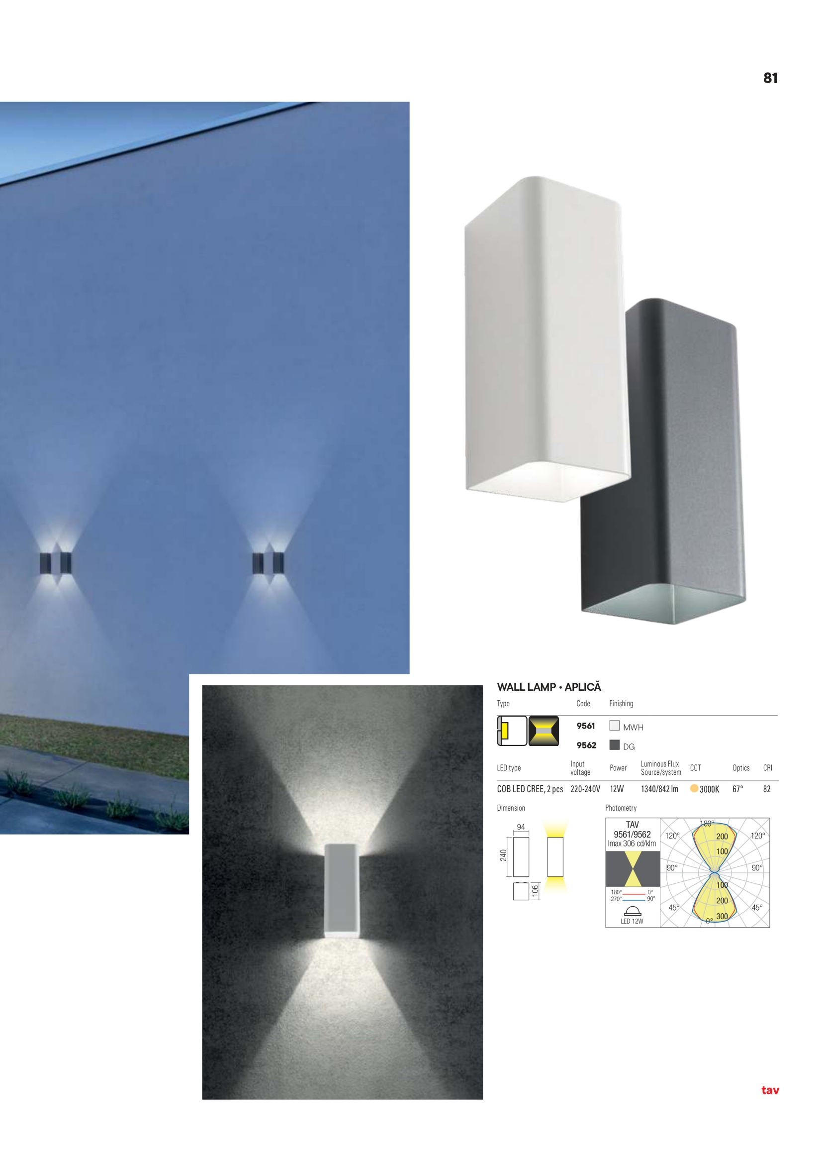 Осветителното тяло 9562 представлява аплик, външна лампа в съвременен стил. 9562 е от категорията осветителни тела и е подходящо за осветяване на различни помещения и пространства като: външно осветление, фасадно осветление.