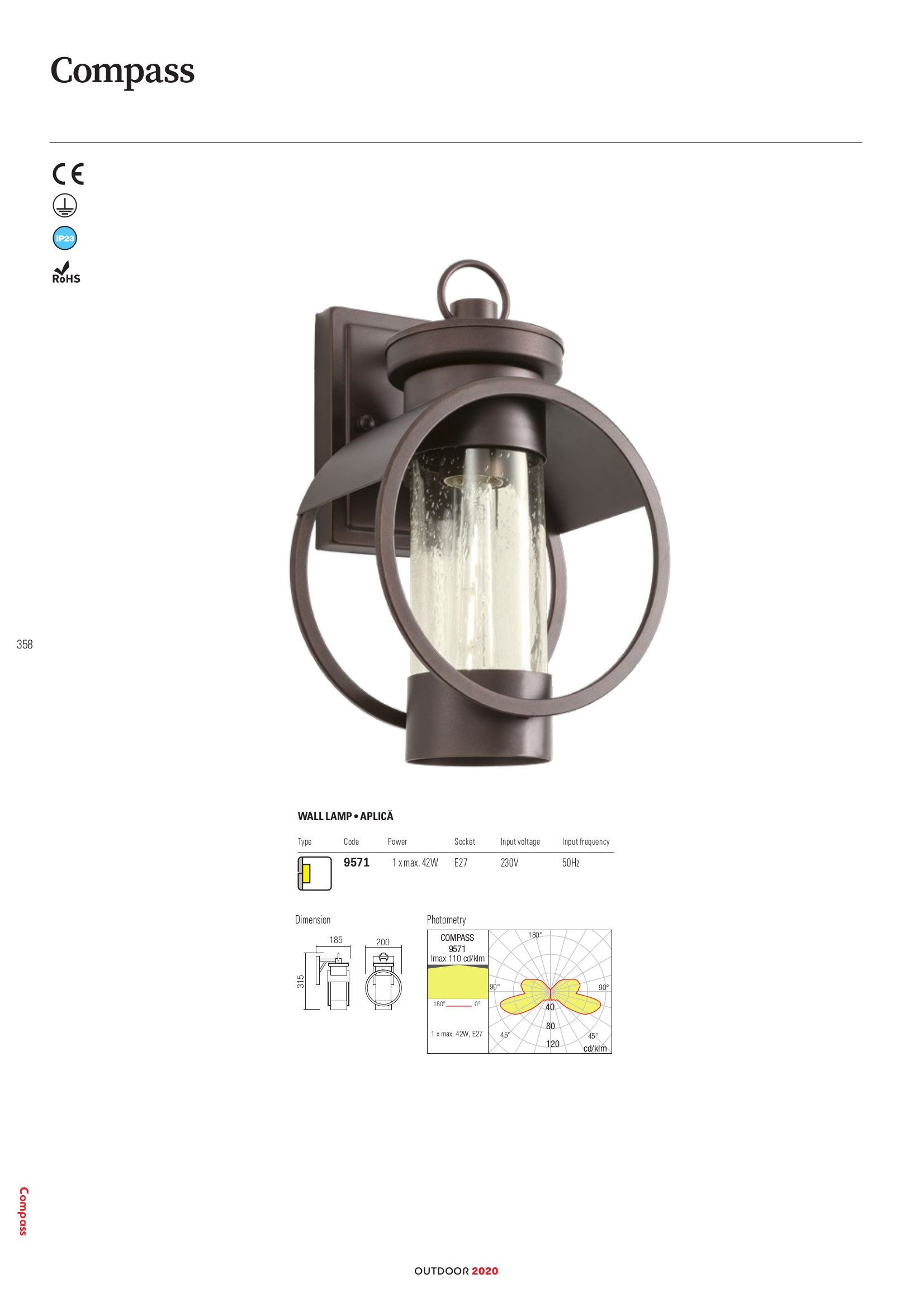 Осветителното тяло 9571 COMPASS wall E27 IP23 ще осигури комфорт и естетика във всяко помещение, в което се постави. Цялостната визия и дизайн на лампата и вложените в изработката й материали, като метал в тъмно кафяв цвят, разсейвател на светлина от стъкло с мехурчета, ще допринесат за един неповторим стил. Благодарение на дългогодишния опит, качествените материали и строгия контрол на качеството на изработка на дизайнерската линия Redo Outdoor на производителя Redo (Румъния), 9571 COMPASS wall E27 IP23 е на високо европейско ниво.