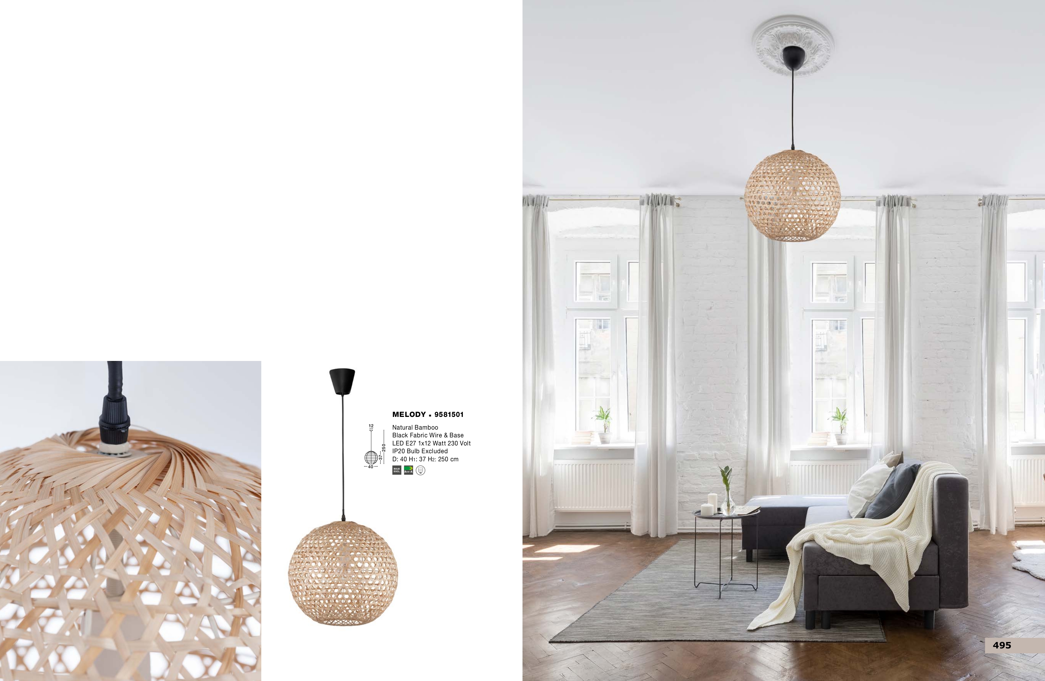 Осветителното тяло 9581501 ще осигури комфорт и естетика във всяко помещение, в което се постави. Цялостната визия и дизайн на лампата и вложените в изработката й материали, като натурален бамбук, кабел с черна текстилна оплетка, ще допринесат за един неповторим стил. Благодарение на дългогодишния опит, качествените материали и строгия контрол на качеството на изработка на производителя Nova-Luce (Гърция), 9581501 е на високо европейско ниво.